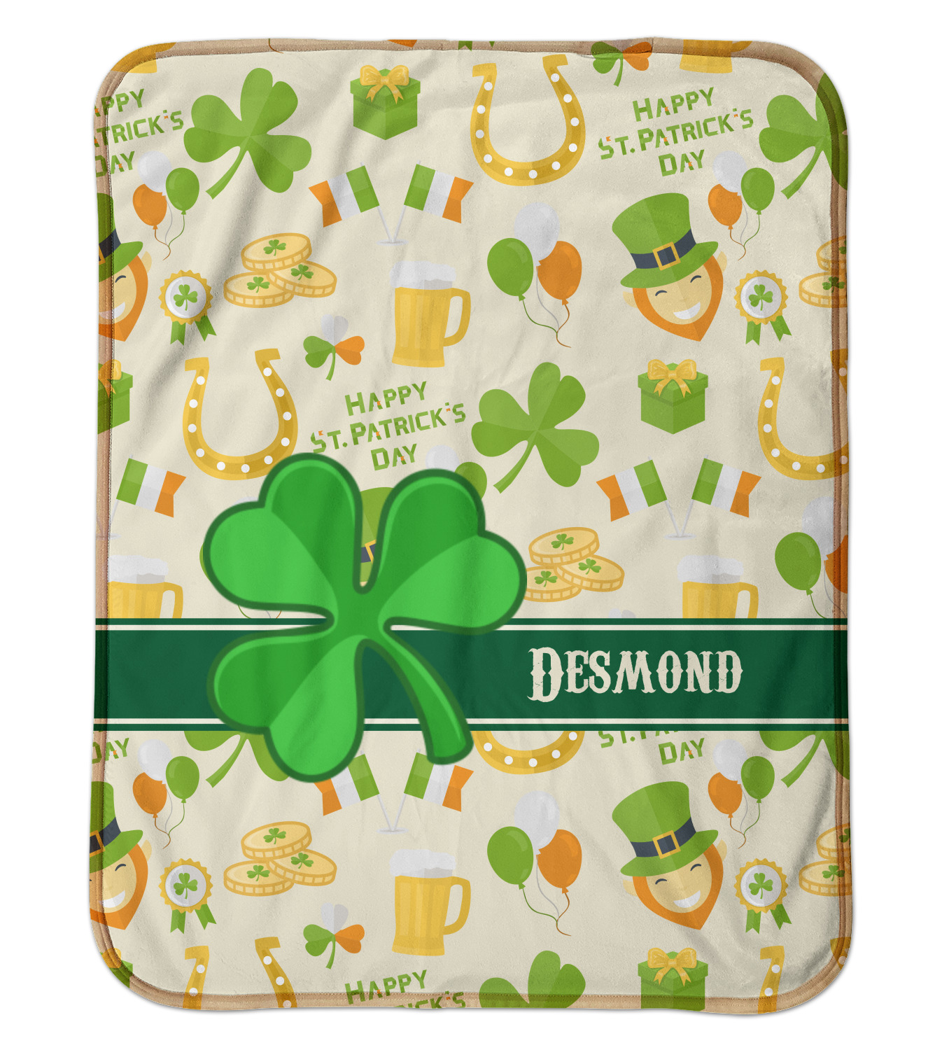 This lucky design has a lovely light cream background. There is a festive assortment of colors in all the graphics that make up the background including orange, green, and yellow. You'll find leprechauns, gold, beer, and Irish pride all in this one design! A large lucky clover is featured largely in the foreground of the design with a ribbon sitting behind it where you put your personalization.