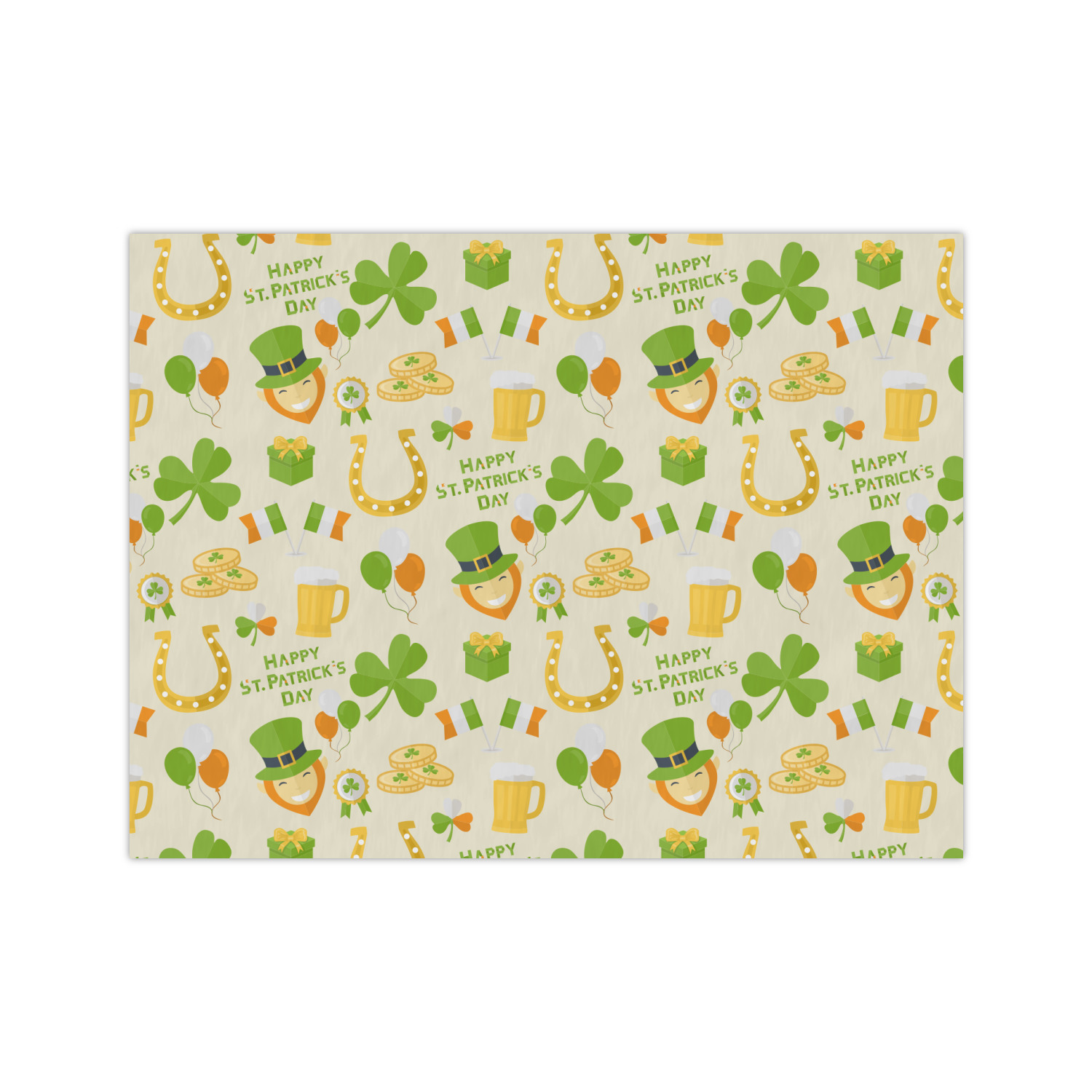 This lucky design has a lovely light cream background. There is a festive assortment of colors in all the graphics that make up the background including orange, green, and yellow. You'll find leprechauns, gold, beer, and Irish pride all in this one design! A large lucky clover is featured largely in the foreground of the design with a ribbon sitting behind it where you put your personalization.