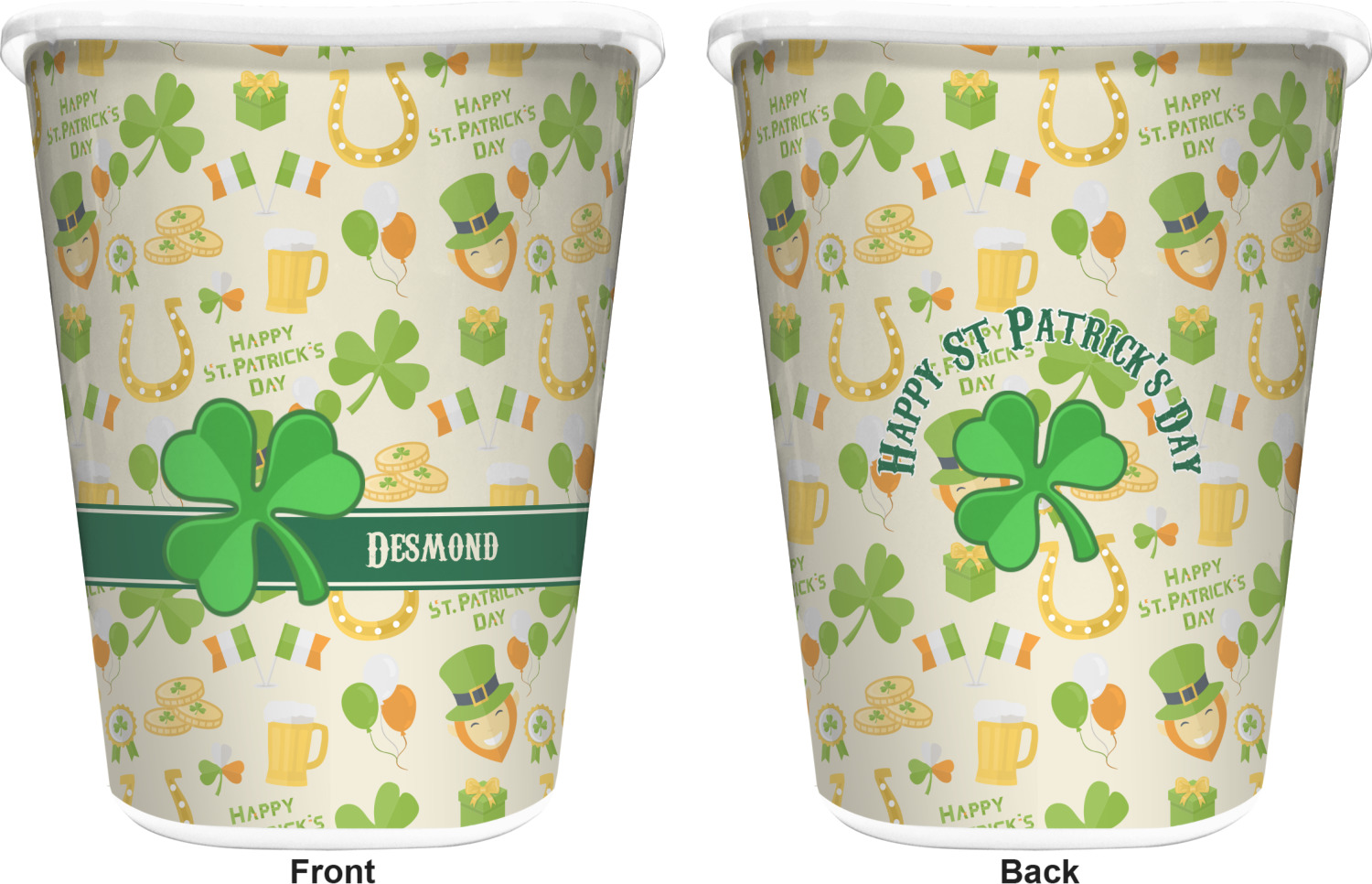 You can choose to purchase these decorative wastebaskets in either a white or a black color that will show on the base and the upper rim. Your customization is printed on a high-gloss, fine-quality vinyl adhesive, and you can choose to either have this adhesive applied to one side only or to both sides. As such, this plastic wastebasket can be single-sided or double-sided, depending on your creative vision. Your customization is printed using durable inks, making the design waterproof and resistant to fading over time.