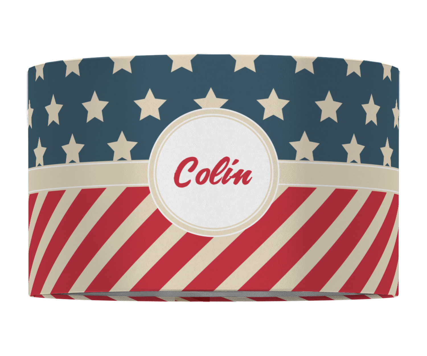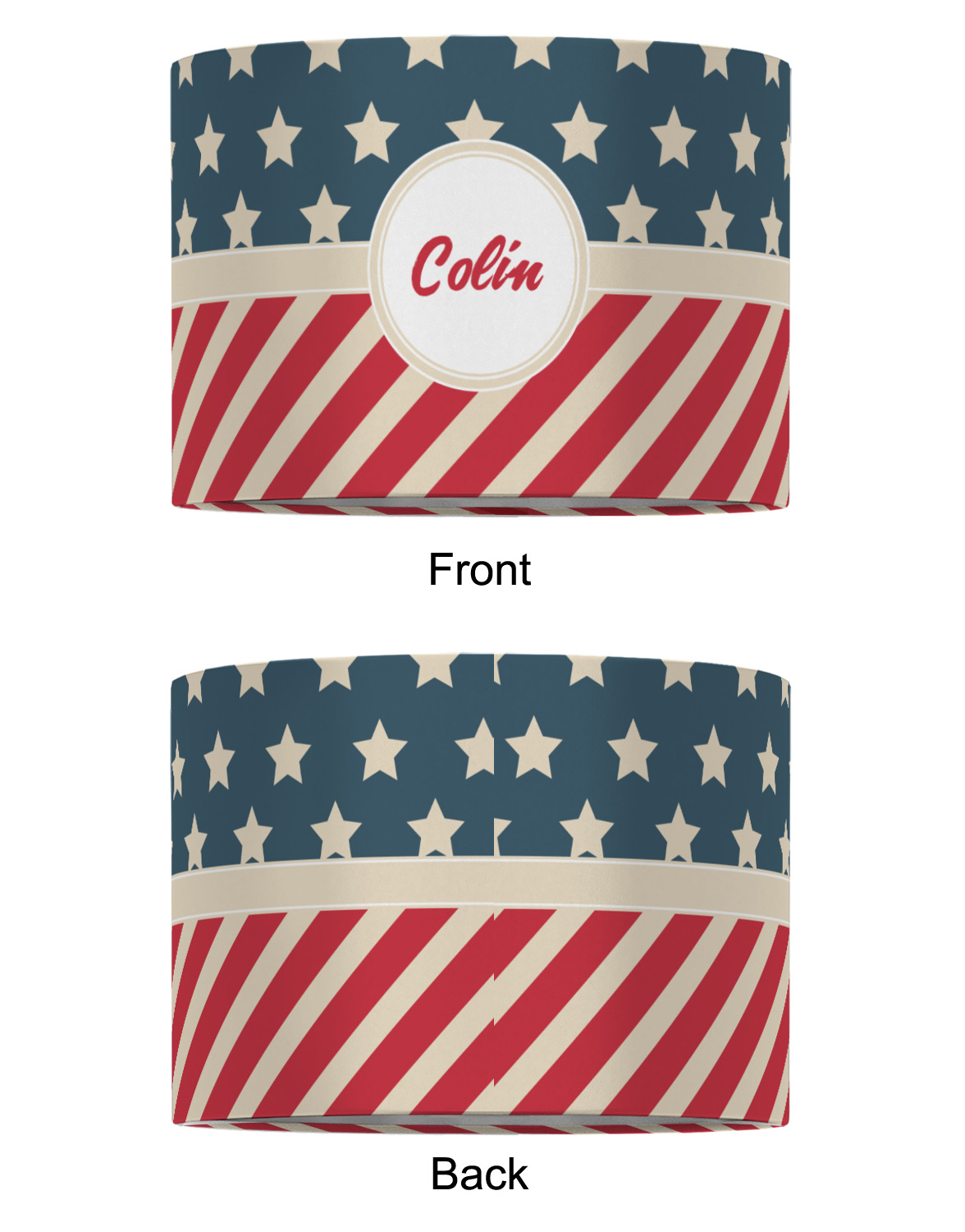This design is a dark blue, bright red, and cream. The top half is white stars and a dark blue background, while the bottom half is a red and cream diagonal striped background. The backgrounds are divided by a cream ribbon and frame with your personalization in the middle. Have fun decorating with this classic patriotic design.