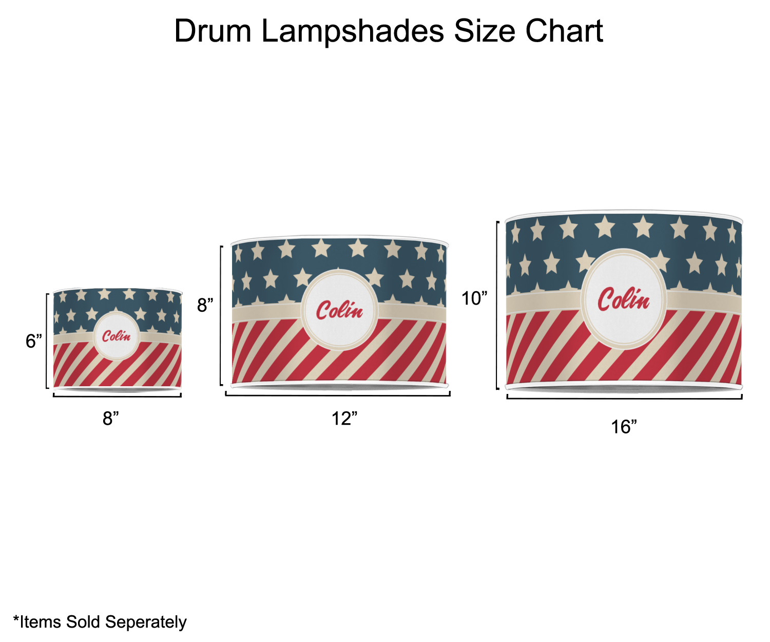 Our customized lamp shades also come in 3 different sizes: 8", 12" and 16", measuring at 8" in diameter by 6" tall, 12" in diameter by 8" tall, and 16" in diameter by 10" tall, respectively.