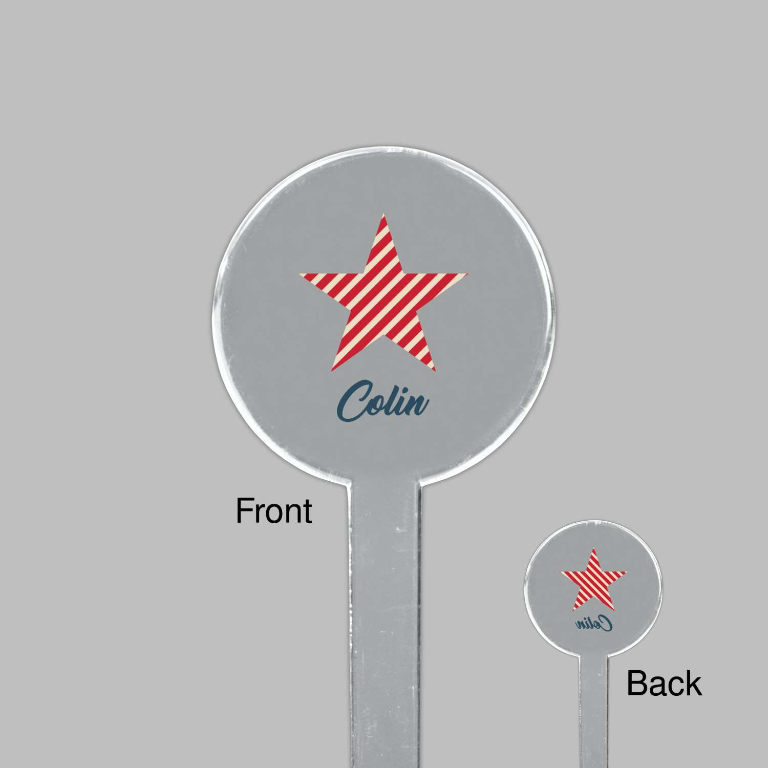 This design is a dark blue, bright red, and cream. The top half is white stars and a dark blue background, while the bottom half is a red and cream diagonal striped background. The backgrounds are divided by a cream ribbon and frame with your personalization in the middle. Have fun decorating with this classic patriotic design.
