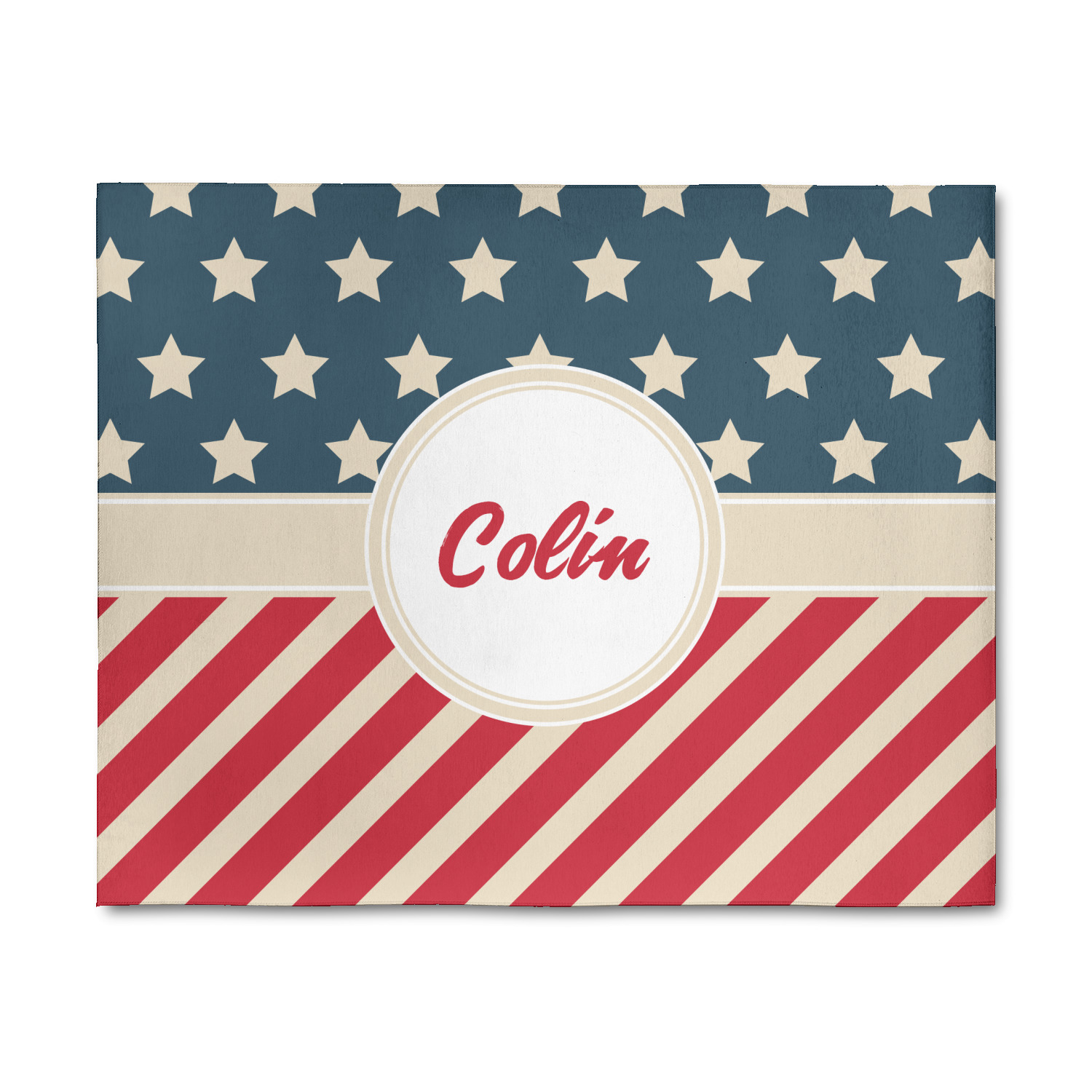 This design is a dark blue, bright red, and cream. The top half is white stars and a dark blue background, while the bottom half is a red and cream diagonal striped background. The backgrounds are divided by a cream ribbon and frame with your personalization in the middle. Have fun decorating with this classic patriotic design.