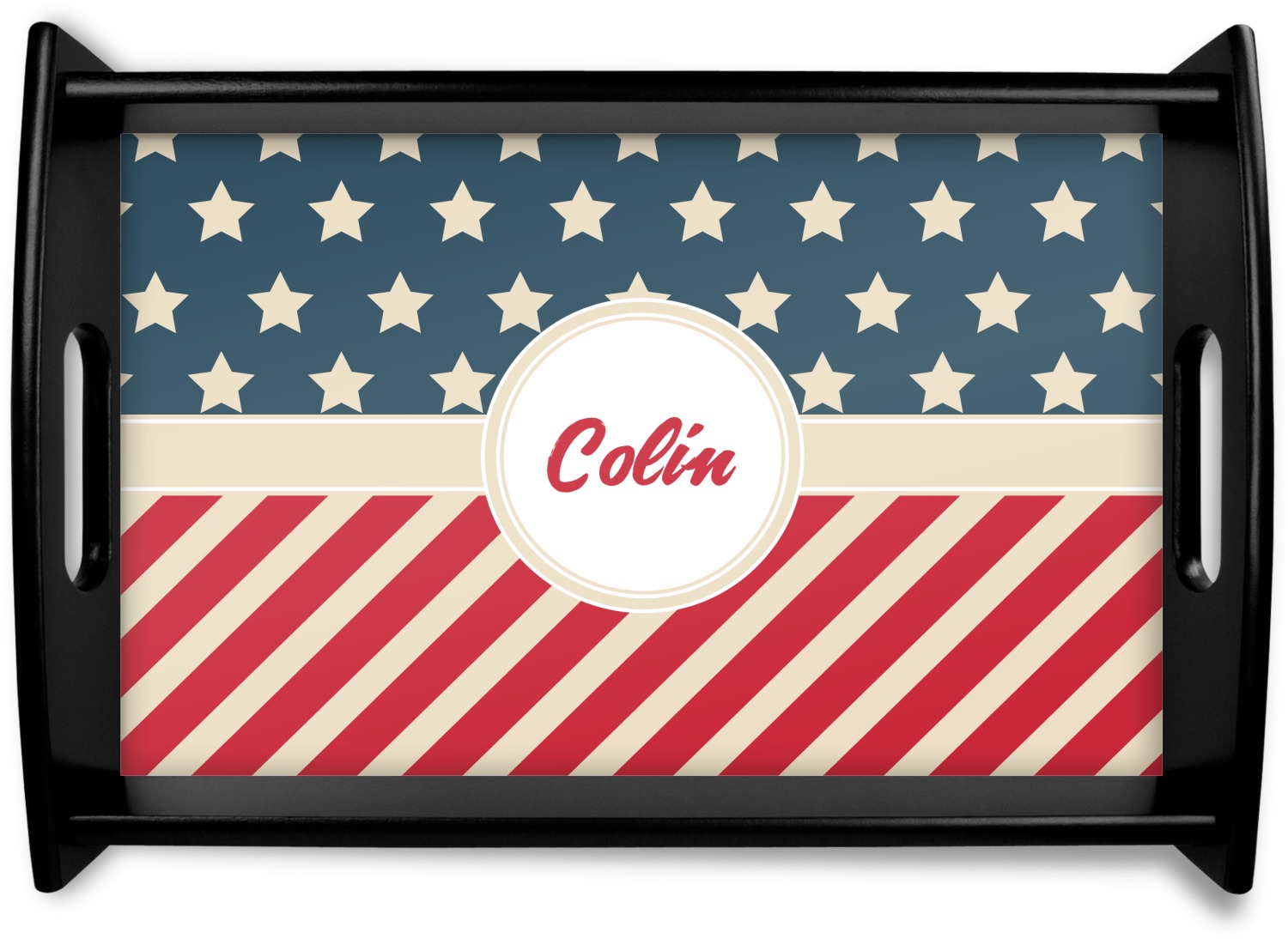 This design is a dark blue, bright red, and cream. The top half is white stars and a dark blue background, while the bottom half is a red and cream diagonal striped background. The backgrounds are divided by a cream ribbon and frame with your personalization in the middle. Have fun decorating with this classic patriotic design.