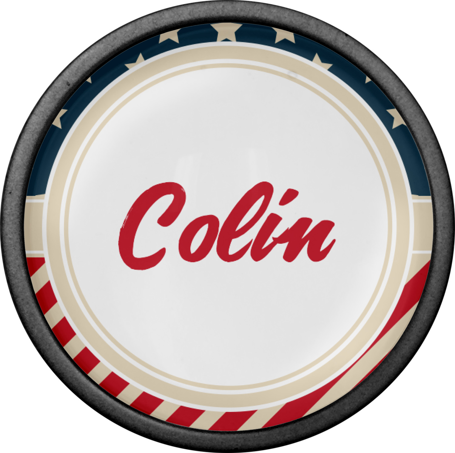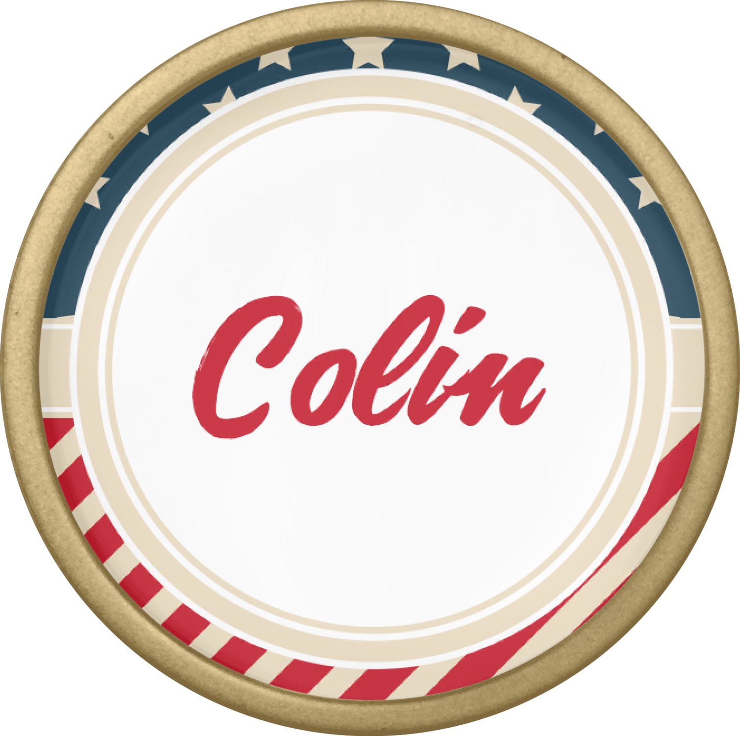 This design is a dark blue, bright red, and cream. The top half is white stars and a dark blue background, while the bottom half is a red and cream diagonal striped background. The backgrounds are divided by a cream ribbon and frame with your personalization in the middle. Have fun decorating with this classic patriotic design.