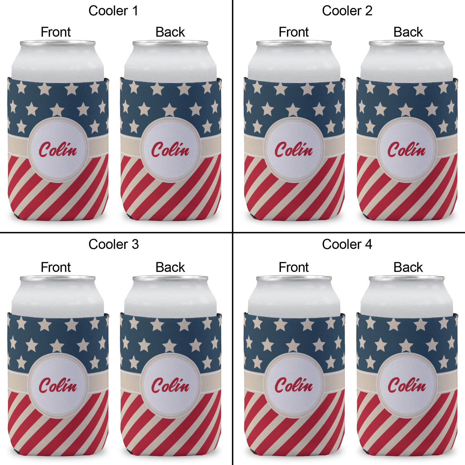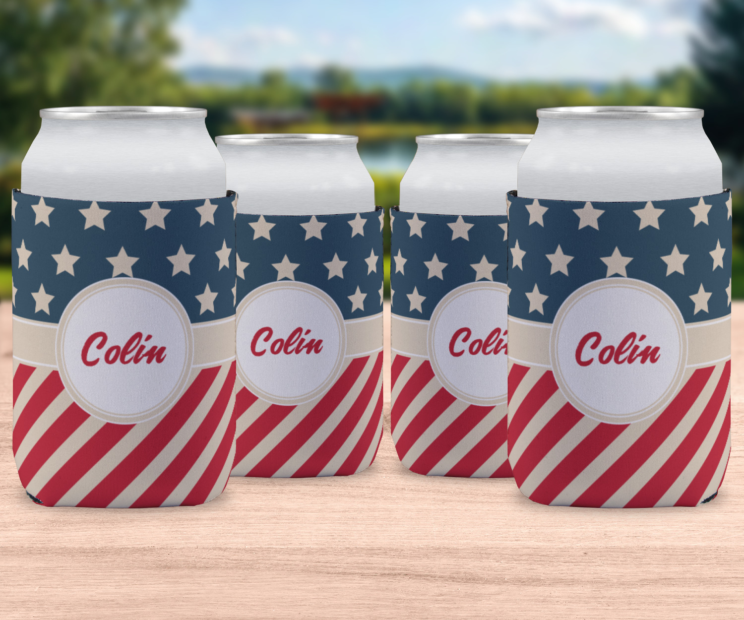 This design is a dark blue, bright red, and cream. The top half is white stars and a dark blue background, while the bottom half is a red and cream diagonal striped background. The backgrounds are divided by a cream ribbon and frame with your personalization in the middle. Have fun decorating with this classic patriotic design.