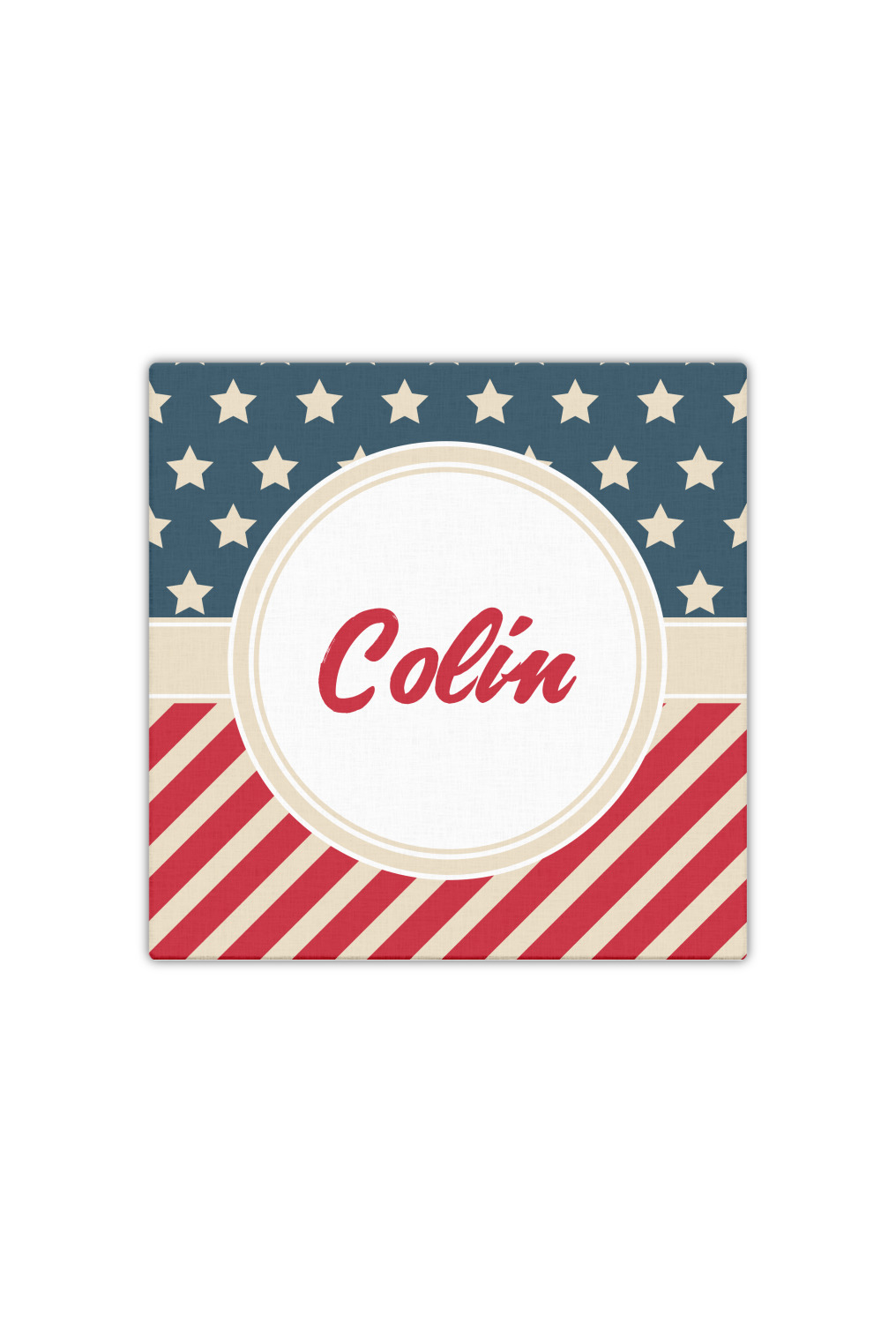 This design is a dark blue, bright red, and cream. The top half is white stars and a dark blue background, while the bottom half is a red and cream diagonal striped background. The backgrounds are divided by a cream ribbon and frame with your personalization in the middle. Have fun decorating with this classic patriotic design.