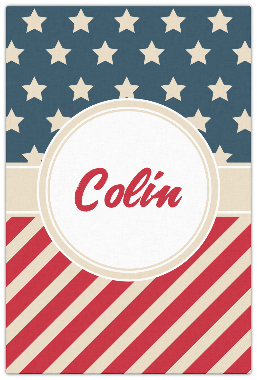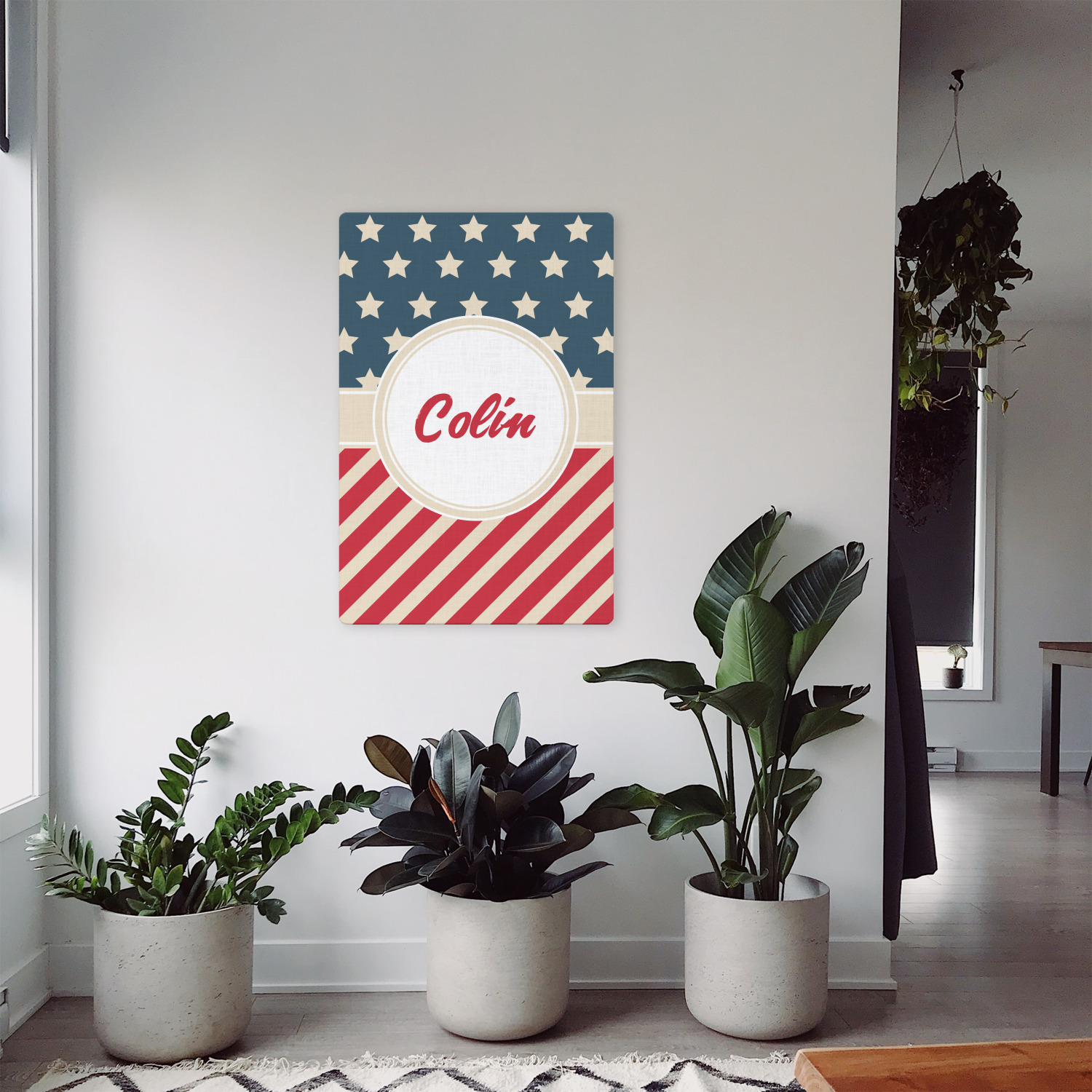 This design is a dark blue, bright red, and cream. The top half is white stars and a dark blue background, while the bottom half is a red and cream diagonal striped background. The backgrounds are divided by a cream ribbon and frame with your personalization in the middle. Have fun decorating with this classic patriotic design.