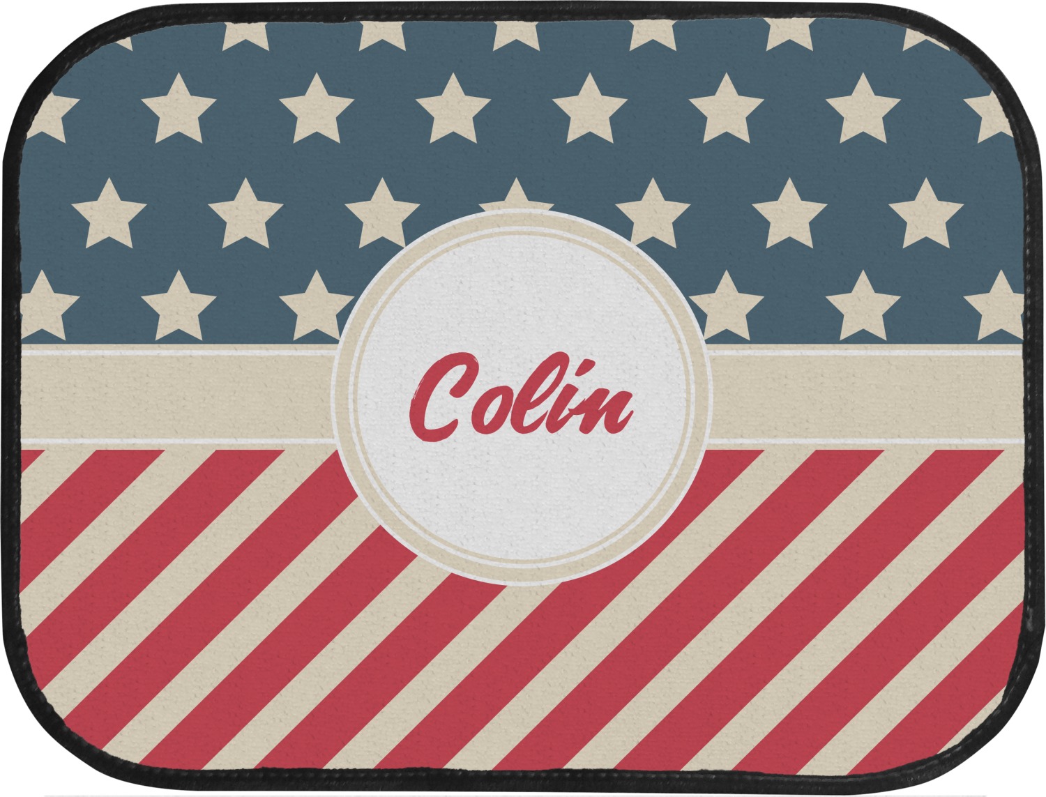 This design is a dark blue, bright red, and cream. The top half is white stars and a dark blue background, while the bottom half is a red and cream diagonal striped background. The backgrounds are divided by a cream ribbon and frame with your personalization in the middle. Have fun decorating with this classic patriotic design.