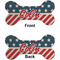 This design is a dark blue, bright red, and cream. The top half is white stars and a dark blue background, while the bottom half is a red and cream diagonal striped background. The backgrounds are divided by a cream ribbon and frame with your personalization in the middle. Have fun decorating with this classic patriotic design.
