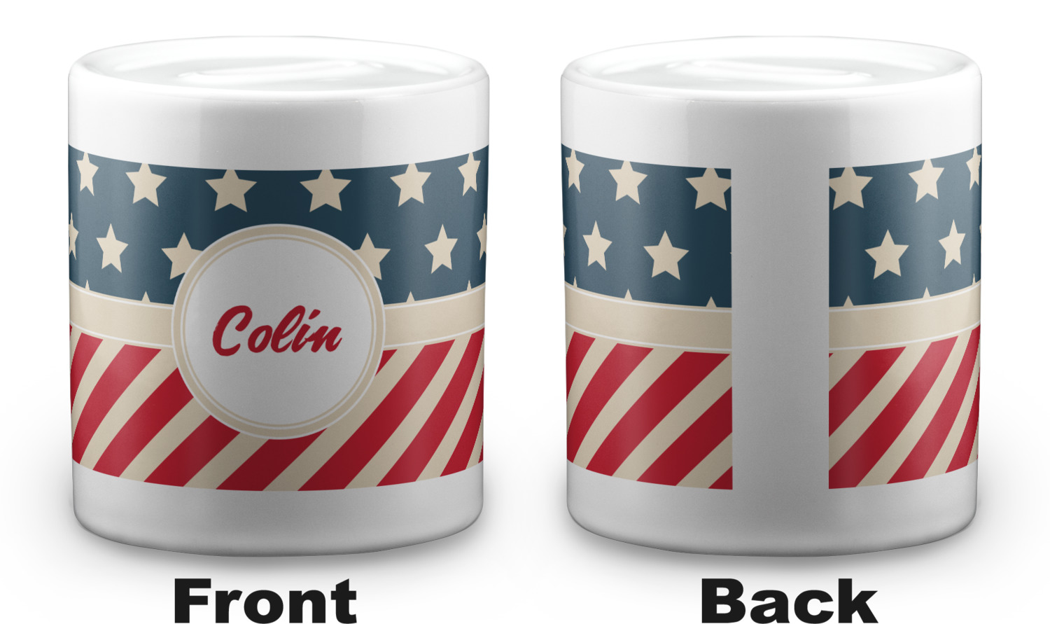 This design is a dark blue, bright red, and cream. The top half is white stars and a dark blue background, while the bottom half is a red and cream diagonal striped background. The backgrounds are divided by a cream ribbon and frame with your personalization in the middle. Have fun decorating with this classic patriotic design.