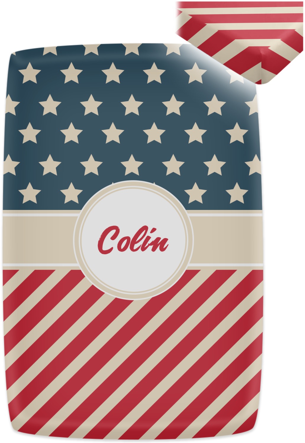 This design is a dark blue, bright red, and cream. The top half is white stars and a dark blue background, while the bottom half is a red and cream diagonal striped background. The backgrounds are divided by a cream ribbon and frame with your personalization in the middle. Have fun decorating with this classic patriotic design.