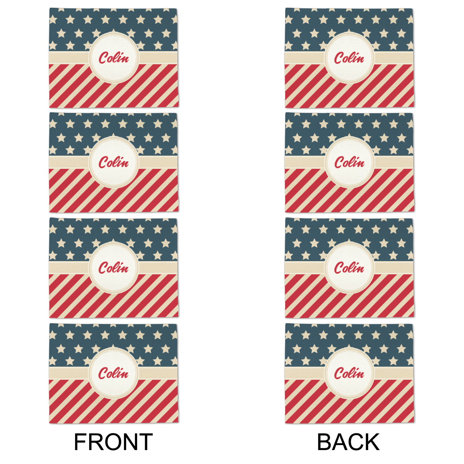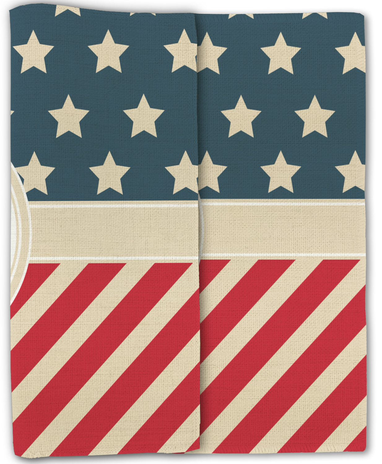 This design is a dark blue, bright red, and cream. The top half is white stars and a dark blue background, while the bottom half is a red and cream diagonal striped background. The backgrounds are divided by a cream ribbon and frame with your personalization in the middle. Have fun decorating with this classic patriotic design.