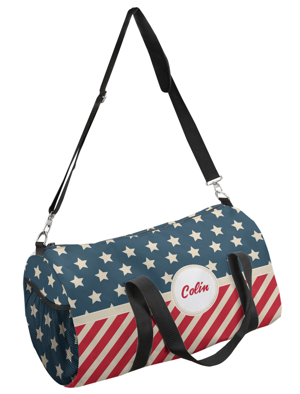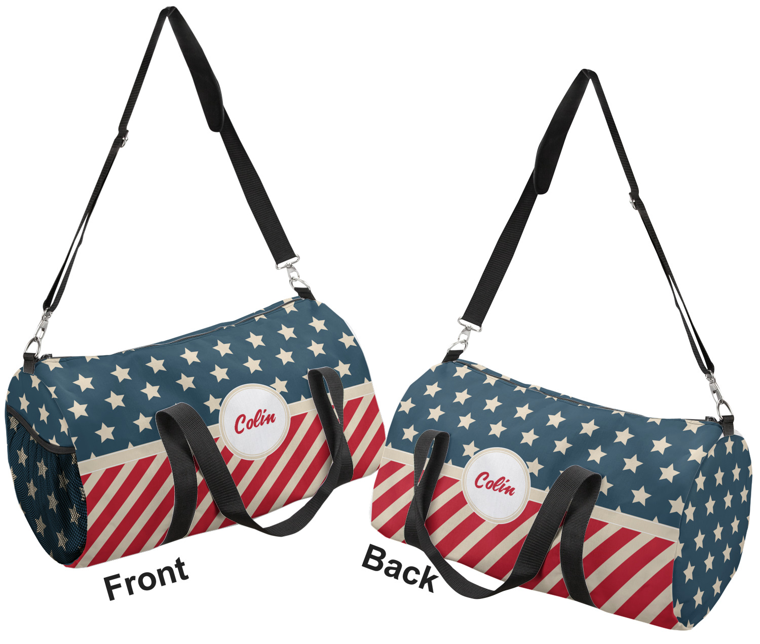 This duffle is a sturdy bag made of a canvas material. It comes in two sizes: Small (19"W x 9.5"H x 9.5"D) and Large (23"W x 12"H x 12"D). The bag is a cylindrical shape with a black adjustable strap and two handles. On one side is an elastic pouch to put a waterbottle or other small item. Your product will be sublimated with your design and is able to be designed on the front, back, and sides. Be sure to remember that the straps may cut into parts of your design if you upload your own artwork.