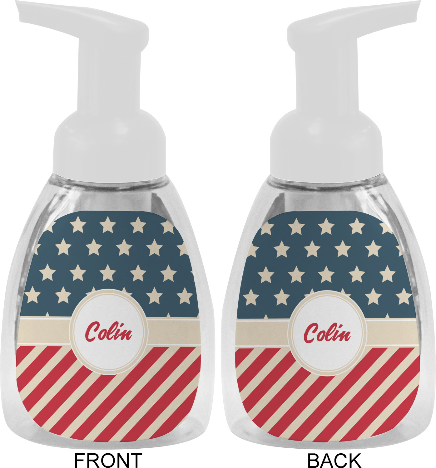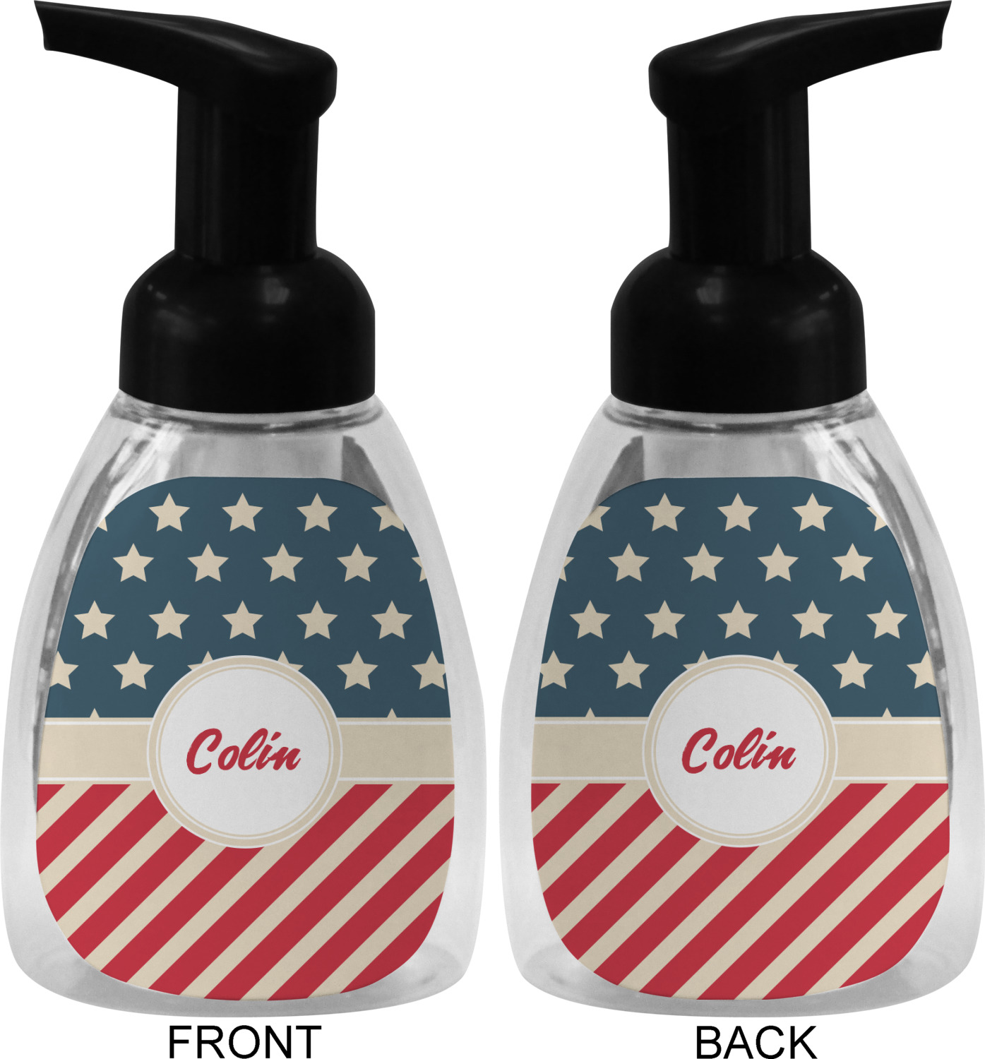This soap dispenser is made of a robust plastic and has a clear base. The included soap pump is available in black or white color. This dispenser is 6.5 inches tall, 3 inches wide, and 2 inches deep. We display your customized designs on the front and back sides of these foaming hand soap dispensers.