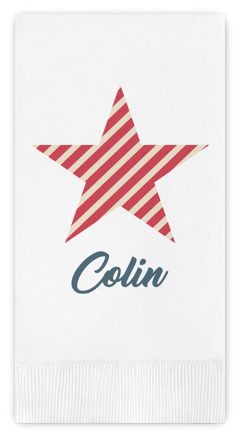This design is a dark blue, bright red, and cream. The top half is white stars and a dark blue background, while the bottom half is a red and cream diagonal striped background. The backgrounds are divided by a cream ribbon and frame with your personalization in the middle. Have fun decorating with this classic patriotic design.
