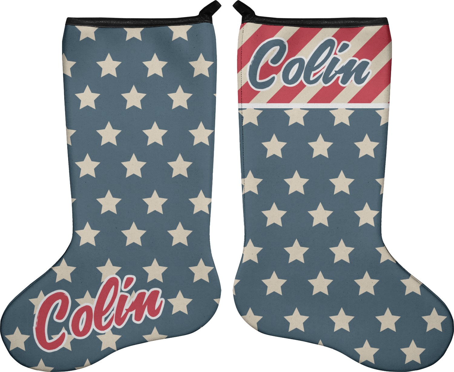 These 17" x 11" stockings are made of neoprene and have a black trim to give them a fantastic finished look. Your very own design is printed right onto the stocking, either single sided with white on the back or double sided where can use the same or different designs / patterns on the front and the back - the choice is yours. At the top of the stocking is a 2" loop for hanging.
