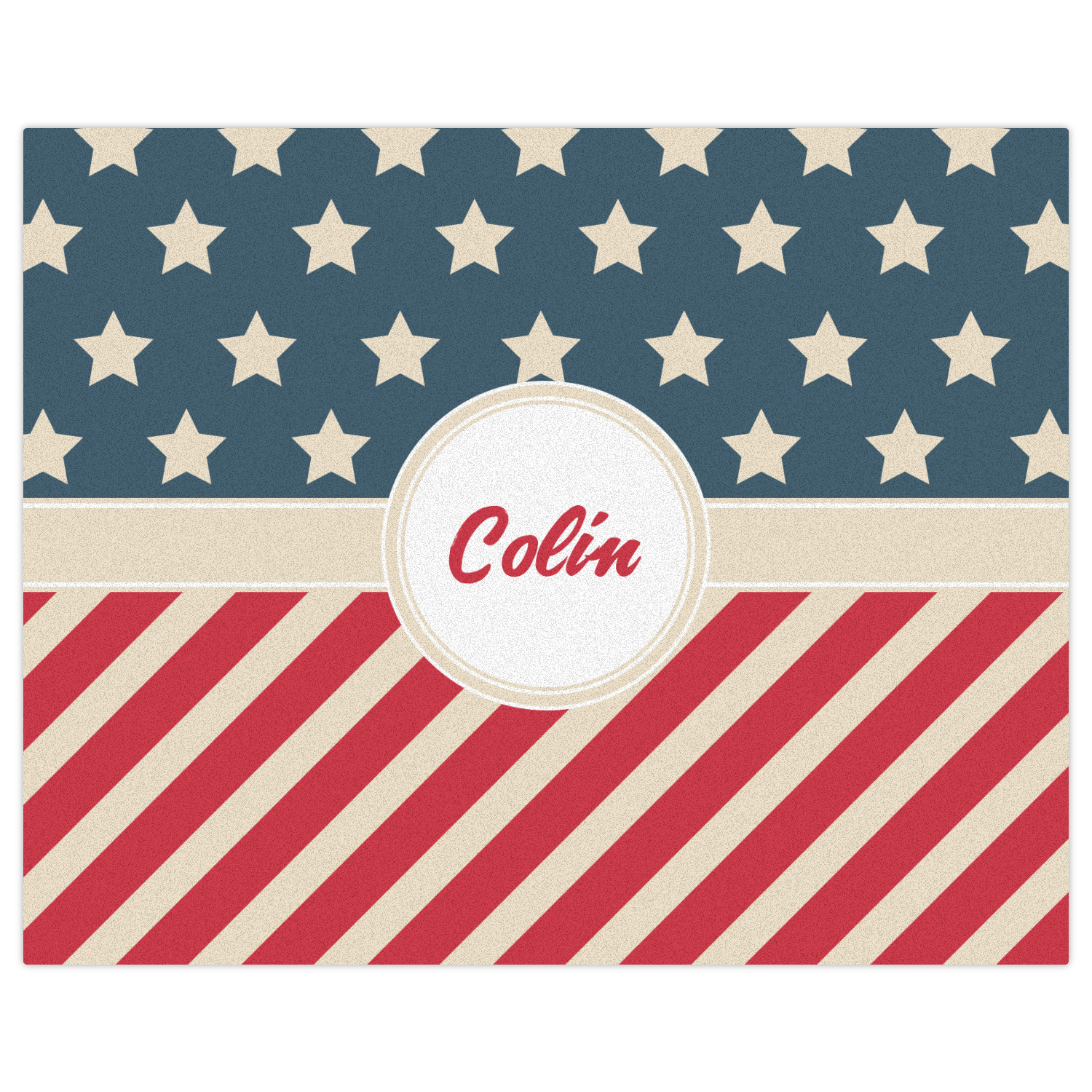 This design is a dark blue, bright red, and cream. The top half is white stars and a dark blue background, while the bottom half is a red and cream diagonal striped background. The backgrounds are divided by a cream ribbon and frame with your personalization in the middle. Have fun decorating with this classic patriotic design.