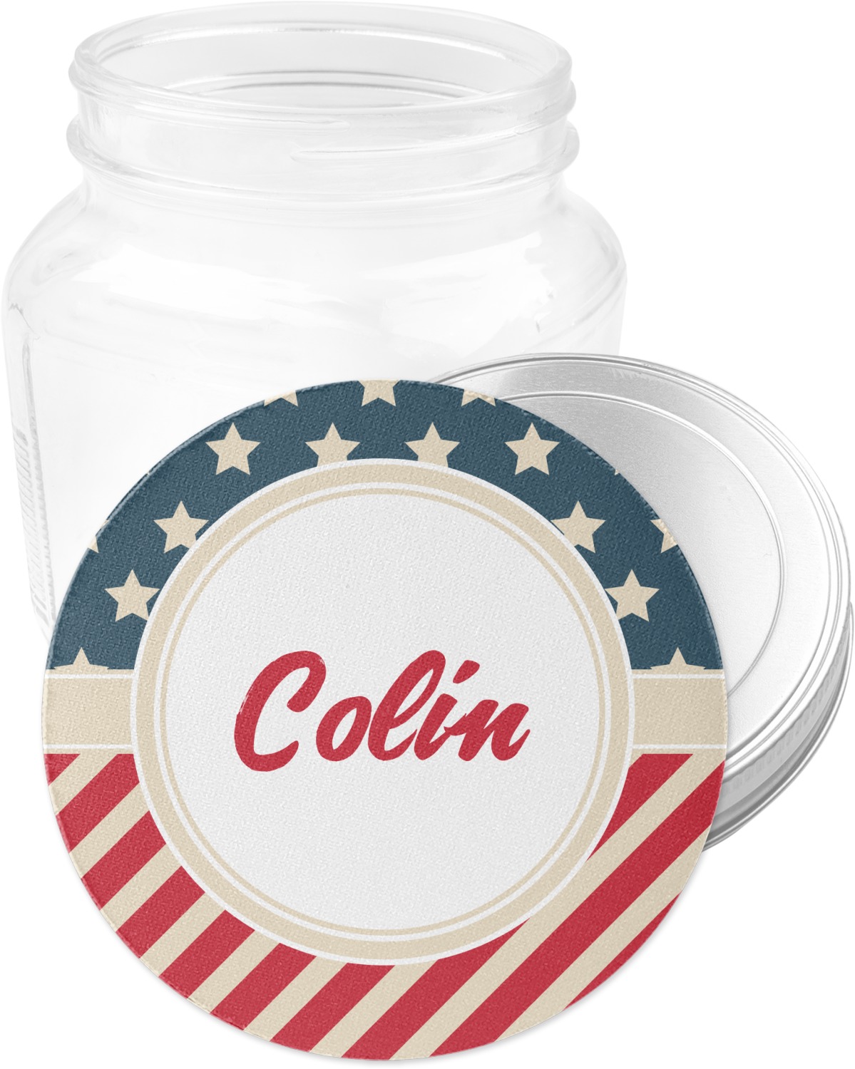This design is a dark blue, bright red, and cream. The top half is white stars and a dark blue background, while the bottom half is a red and cream diagonal striped background. The backgrounds are divided by a cream ribbon and frame with your personalization in the middle. Have fun decorating with this classic patriotic design.
