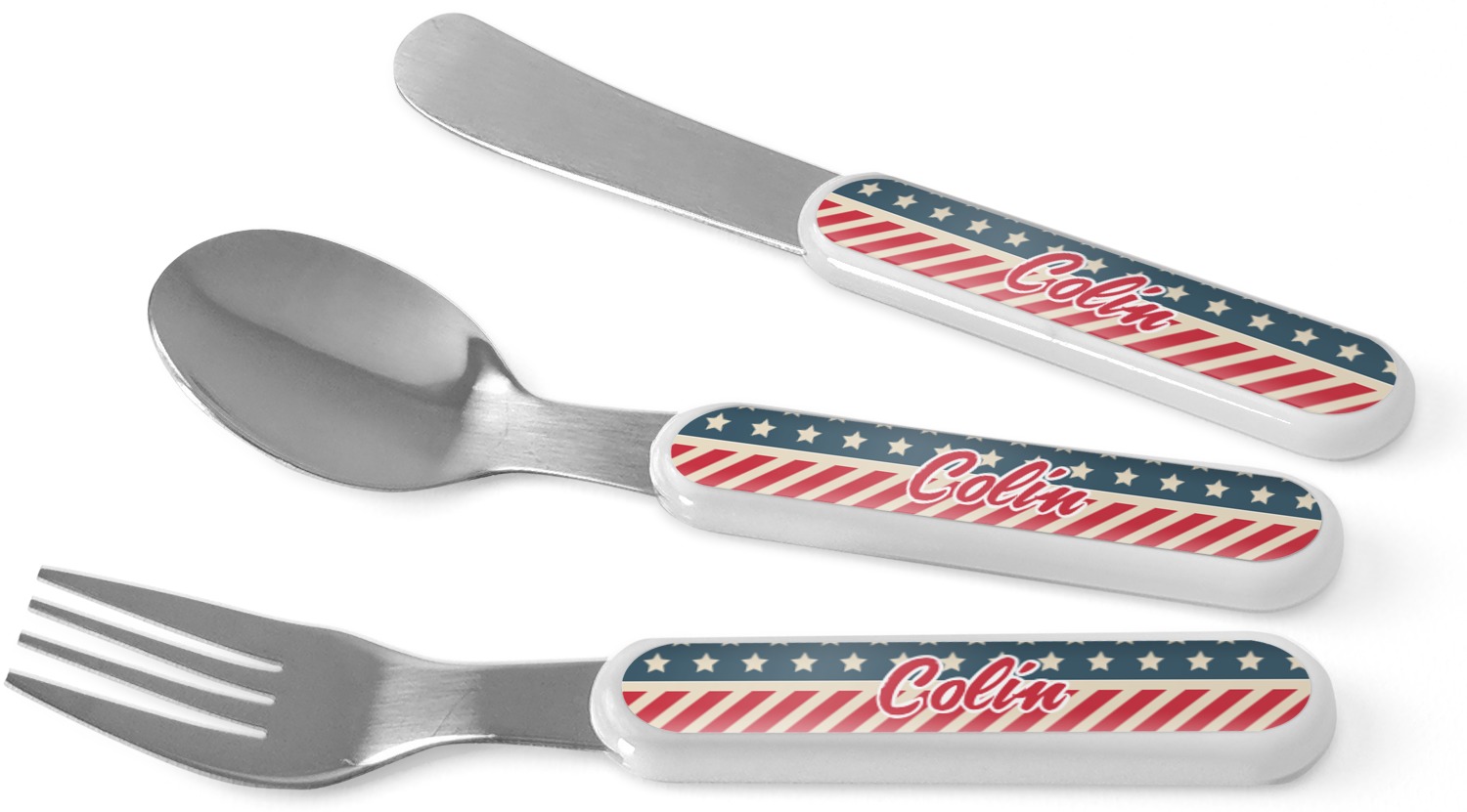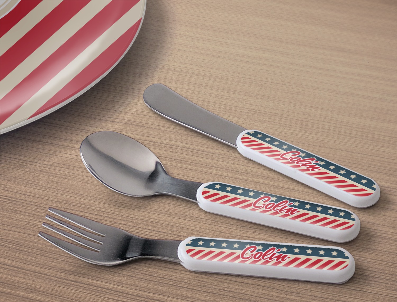 This set of kids' silverware includes a 5.5 inch spoon, fork, and knife, catered to your little one's needs. The prongs of this fork are flat and dull, while our spoon is small enough for tiny mouths, and the dullness of the knife itself resembles a butter knife, at most. These kids' utensils are made of stainless steel, while the handles are crafted from a durable plastic that will withstand the energy and use of your young one. We print your customization across the handles, making the cutlery set unique to your child only.
