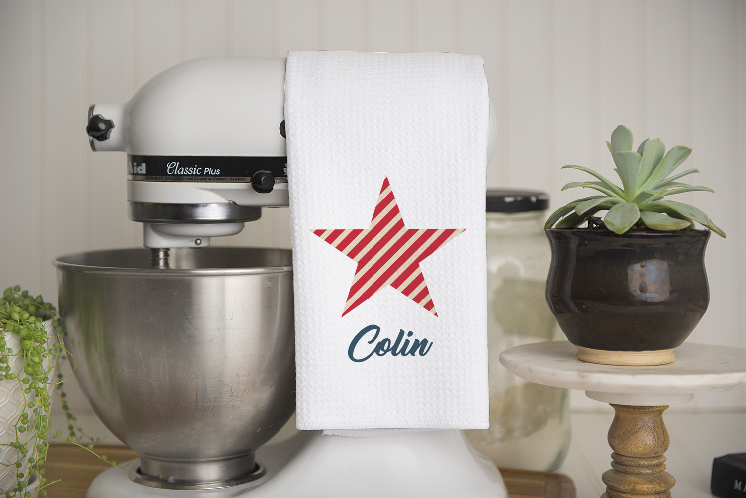 Each waffle weave kitchen towel is approximately 16 x 24 inches with your design printed on one side and the back is white.