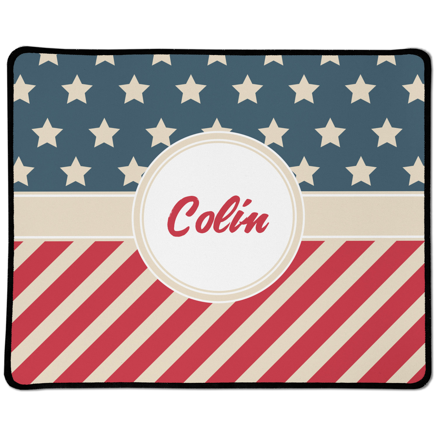 This design is a dark blue, bright red, and cream. The top half is white stars and a dark blue background, while the bottom half is a red and cream diagonal striped background. The backgrounds are divided by a cream ribbon and frame with your personalization in the middle. Have fun decorating with this classic patriotic design.