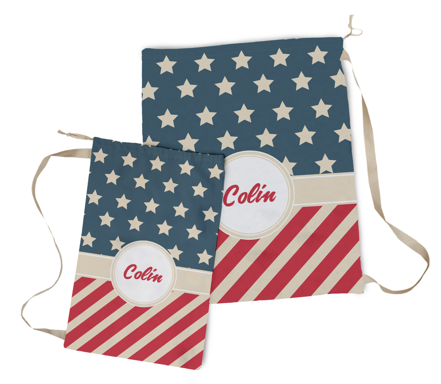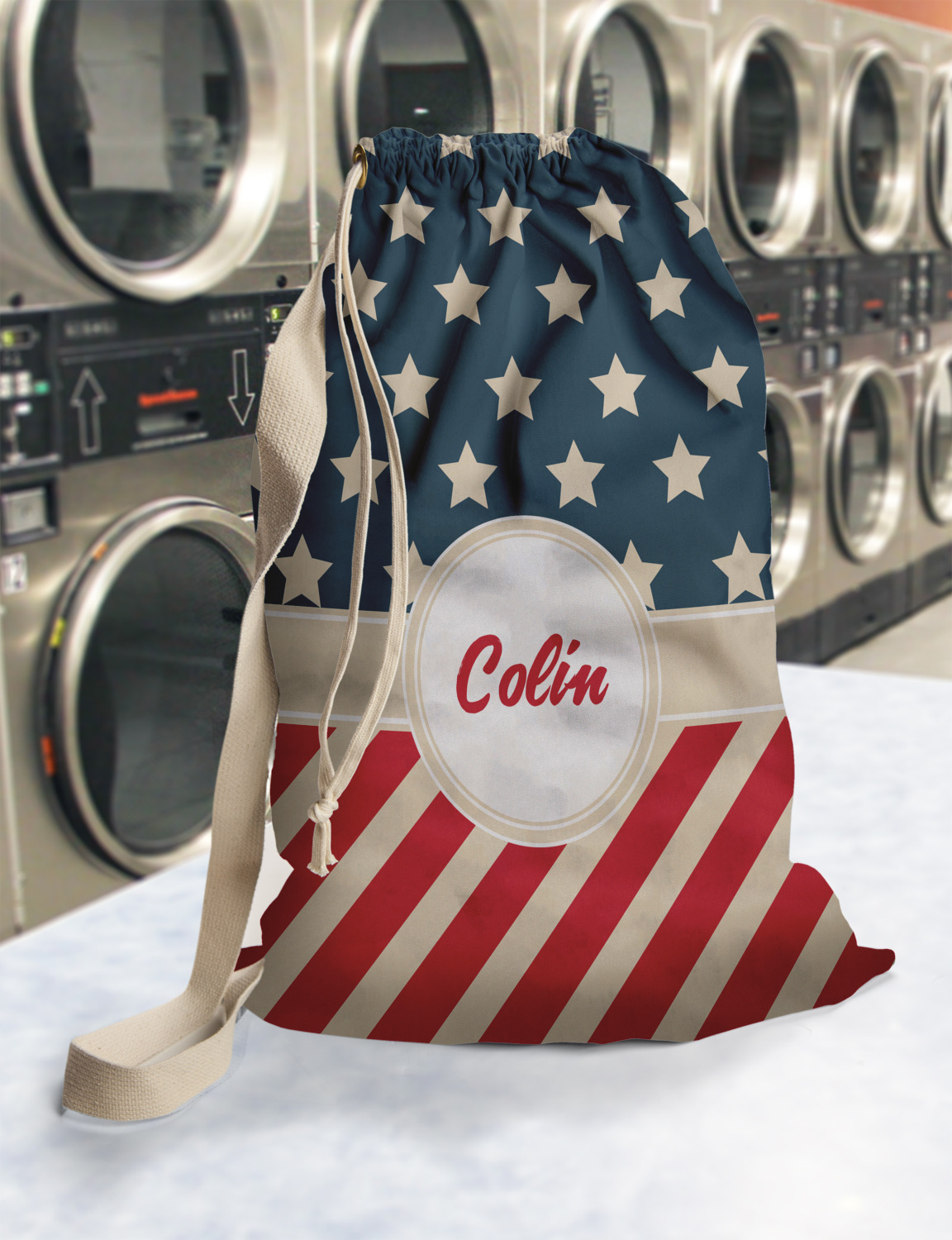 Carry your laundry in style with these customized laundry bags. Available in two sizes, featuring a natural colored woven strap and a cinch cord, these bags hold a lot of clothes or anything else you want to fit in them.