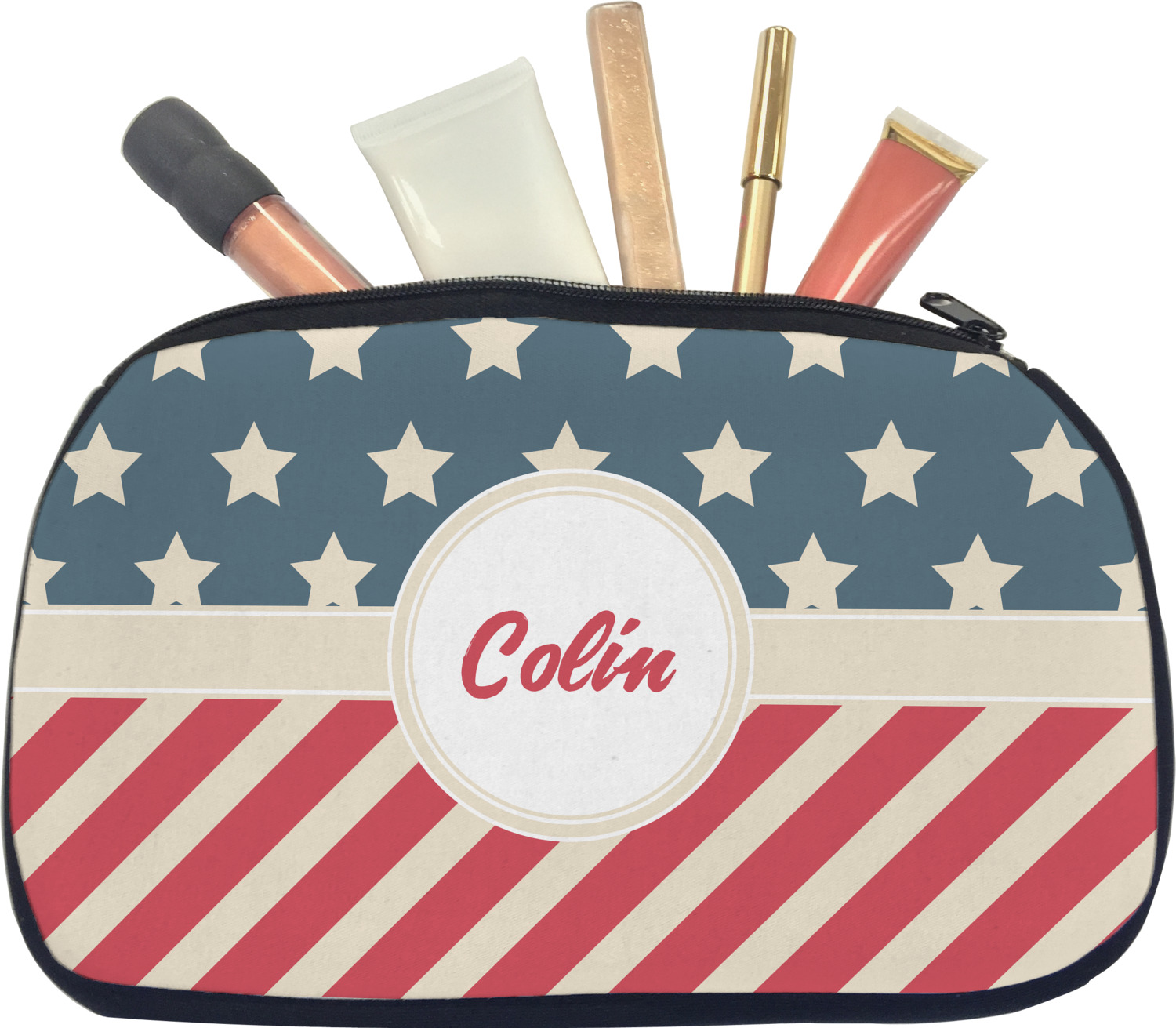 Our makeup bags are available in 2 sizes, small for smaller purses and less makeup, while the medium one for larger purses, as well as more makeup. Neither one of these is big enough for me when I am traveling - so, we do carry custom toiletry bags for travel.