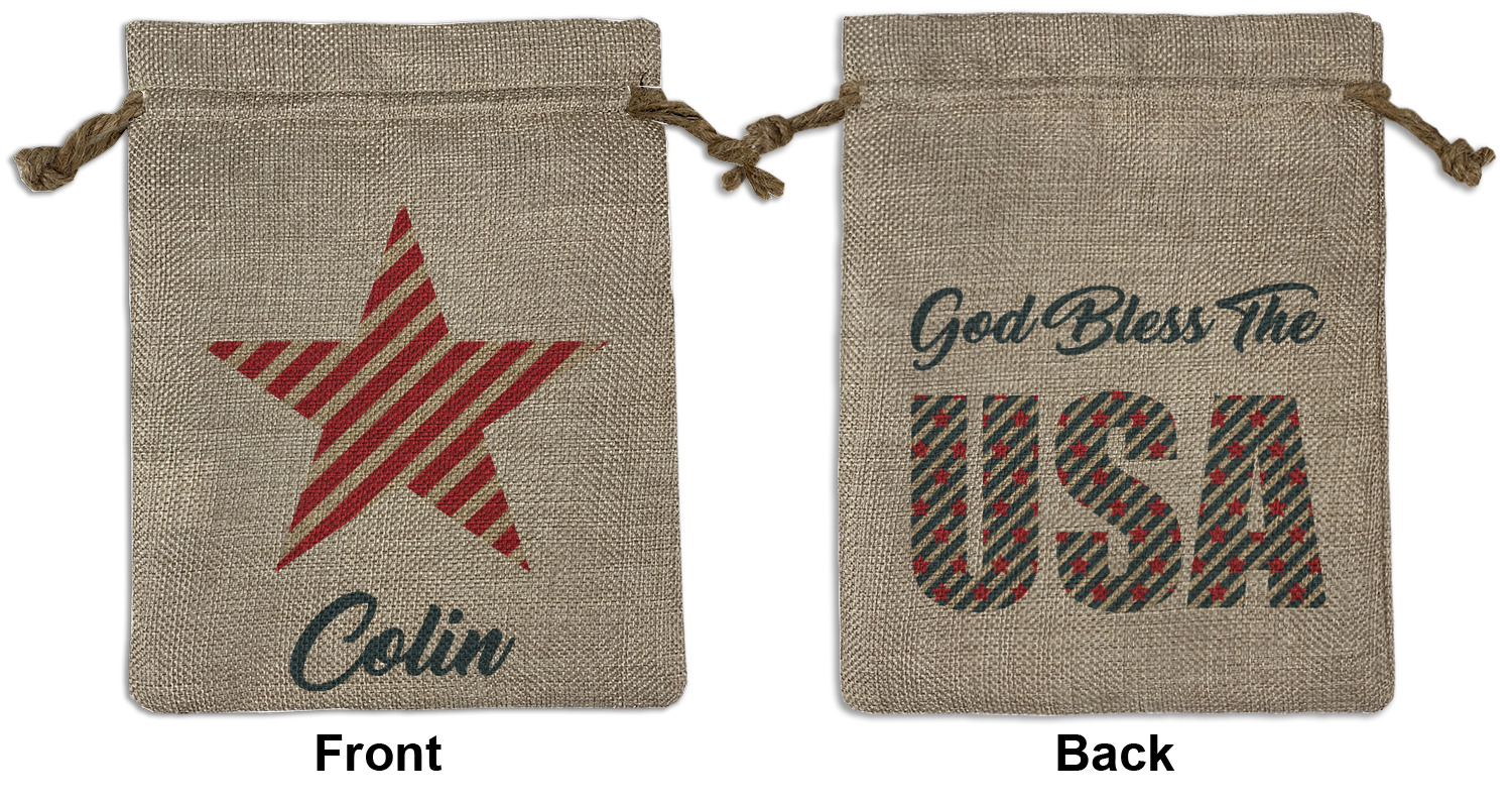 We sell our Burlap Gift Bags in 3 variant sized bags. Made with burlap polyester, each personalized bag can be secured with a twine drawstring pull. Your custom design is available to print on one side or both sides - completely up to you! The sizes of the bags measure approximately 4.5" x 6.5" for the smallest size, 6.5" x 8.0" for the medium size, and 6.5" x 13.5" for the large-sized bag.