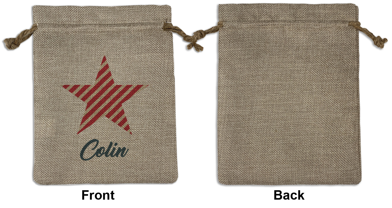 We sell our Burlap Gift Bags in 3 variant sized bags. Made with burlap polyester, each personalized bag can be secured with a twine drawstring pull. Your custom design is available to print on one side or both sides - completely up to you! The sizes of the bags measure approximately 4.5" x 6.5" for the smallest size, 6.5" x 8.0" for the medium size, and 6.5" x 13.5" for the large-sized bag.