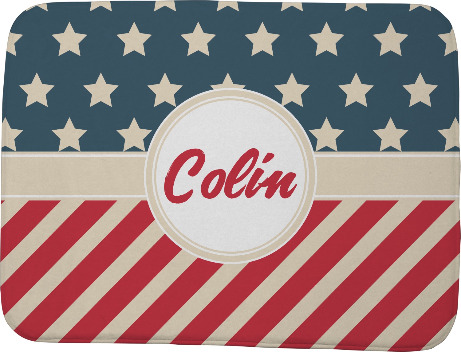 This design is a dark blue, bright red, and cream. The top half is white stars and a dark blue background, while the bottom half is a red and cream diagonal striped background. The backgrounds are divided by a cream ribbon and frame with your personalization in the middle. Have fun decorating with this classic patriotic design.