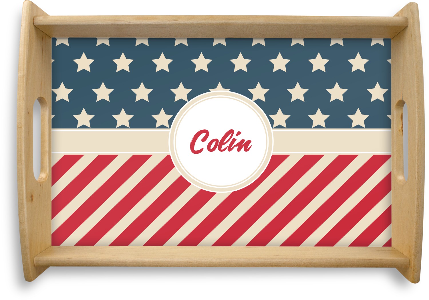 This serving tray with handles features square edges and two rounded sides, creating a very modern look. Each side is fabricated from a beautifully cut, natural wood. The bottom of the interior of the tray displays your customized design in bright, vibrant color. The tray is sold in both a black color and a natural wood look. Each variation of the wood serving tray has two sizes: Small, which is 14" x 10" x 2.25", and Large, which is 19.5" x 13.5" x 2.75".