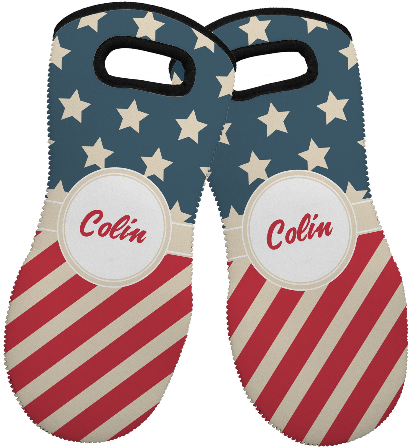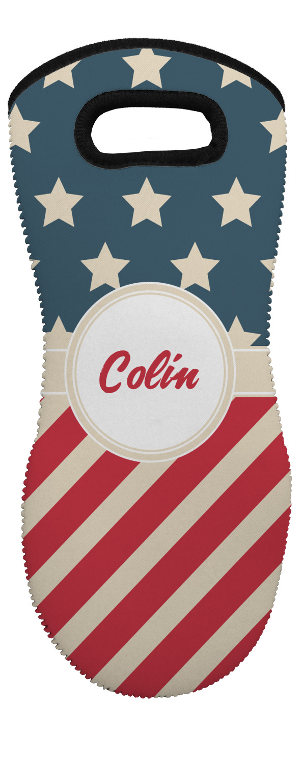 These heat resistant gloves are made entirely of a durable neoprene; the front features a softer texture, while the palm's side has a textured surface, meant to handle heat up to 500 degrees Fahrenheit. Thick, heavy duty stitching connects the two sides. A small, oval cutout appears on the front, and can be used to hang and store the mitt. Your personalization appears on the front, and the upper part of the back of the mitt. The style of these oven mitts are suitable for both the right and left hand, depending on your needs. If you need one for each hand, be sure to order two!