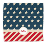 This design is a dark blue, bright red, and cream. The top half is white stars and a dark blue background, while the bottom half is a red and cream diagonal striped background. The backgrounds are divided by a cream ribbon and frame with your personalization in the middle. Have fun decorating with this classic patriotic design.