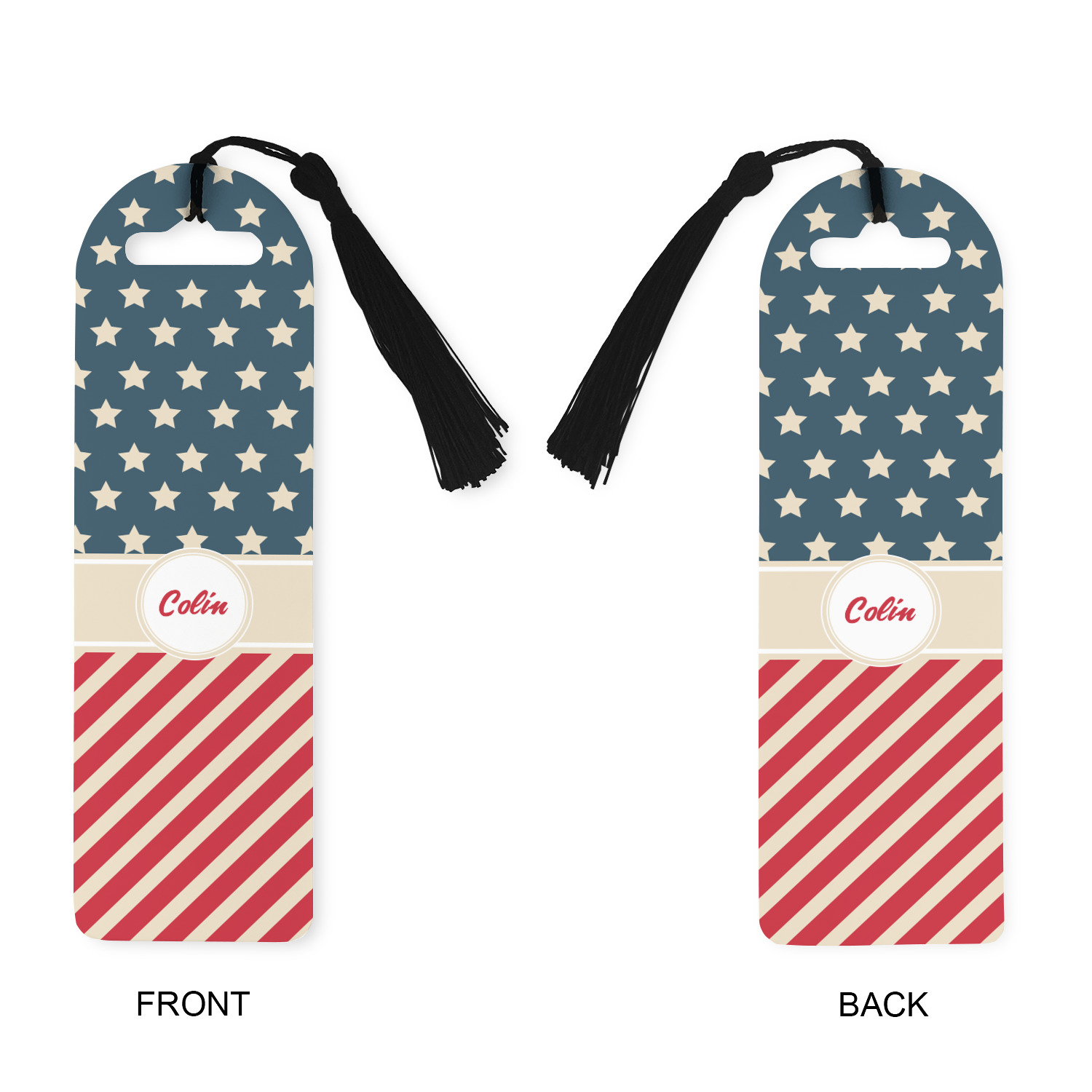 Made from a durable, flexible plastic, these bookmarks are printed with your custom design on them. With the tassel on them they make it easy to find your page in your book. These are a rectangular shape 7 1/4 inches tall with a rounded top and are approximately 2 1/4 inches wide.