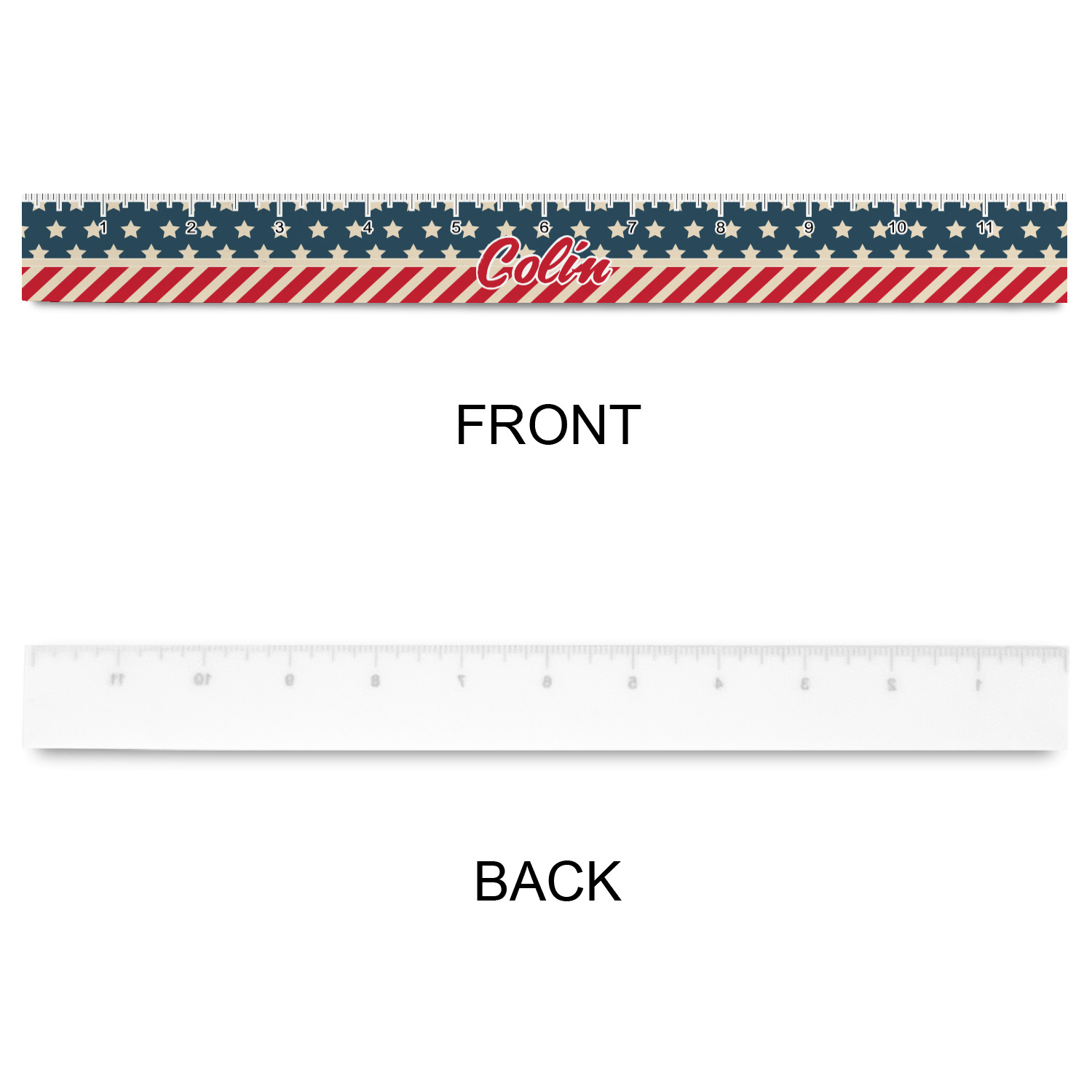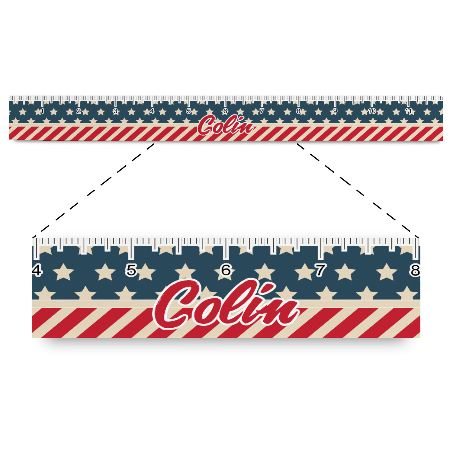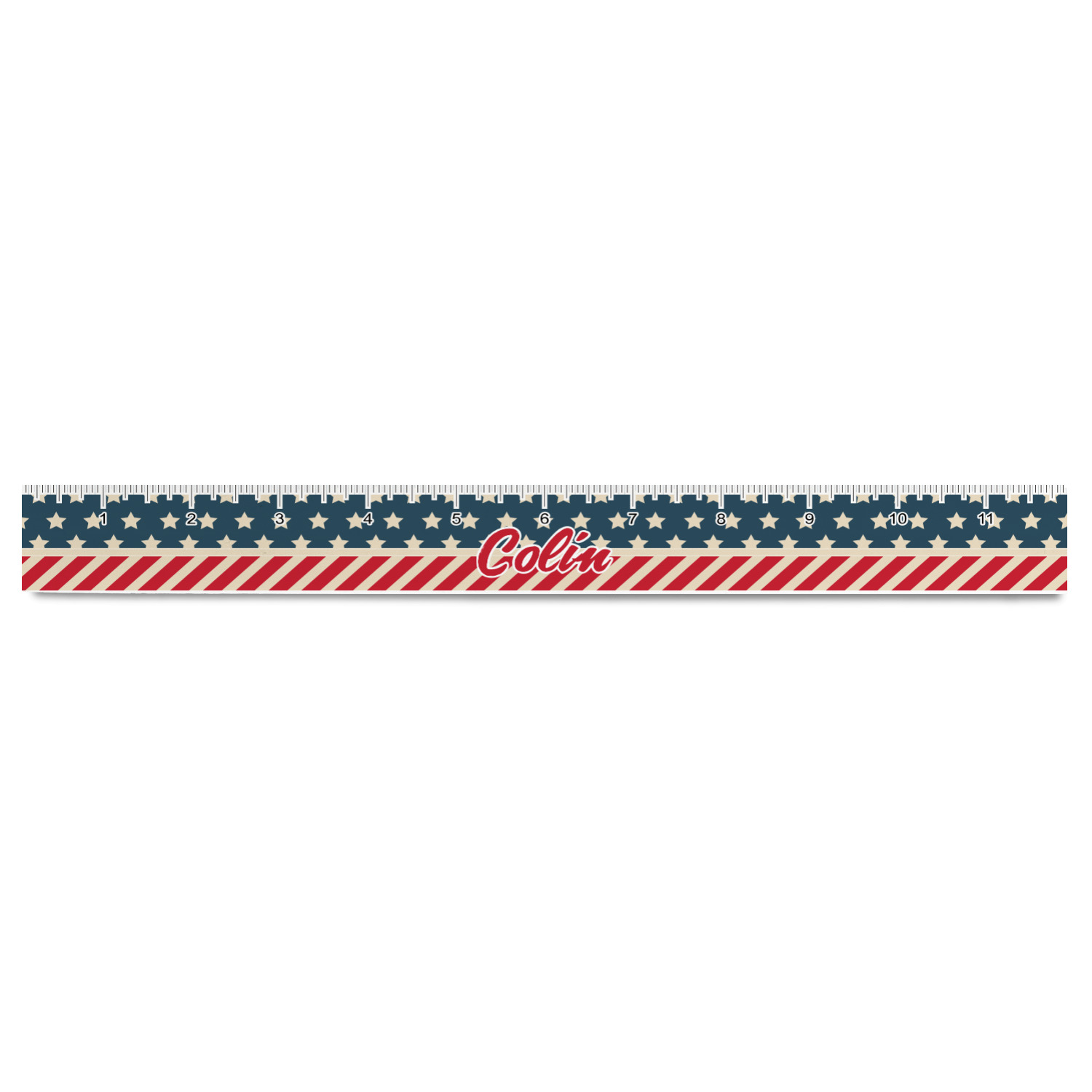 This design is a dark blue, bright red, and cream. The top half is white stars and a dark blue background, while the bottom half is a red and cream diagonal striped background. The backgrounds are divided by a cream ribbon and frame with your personalization in the middle. Have fun decorating with this classic patriotic design.