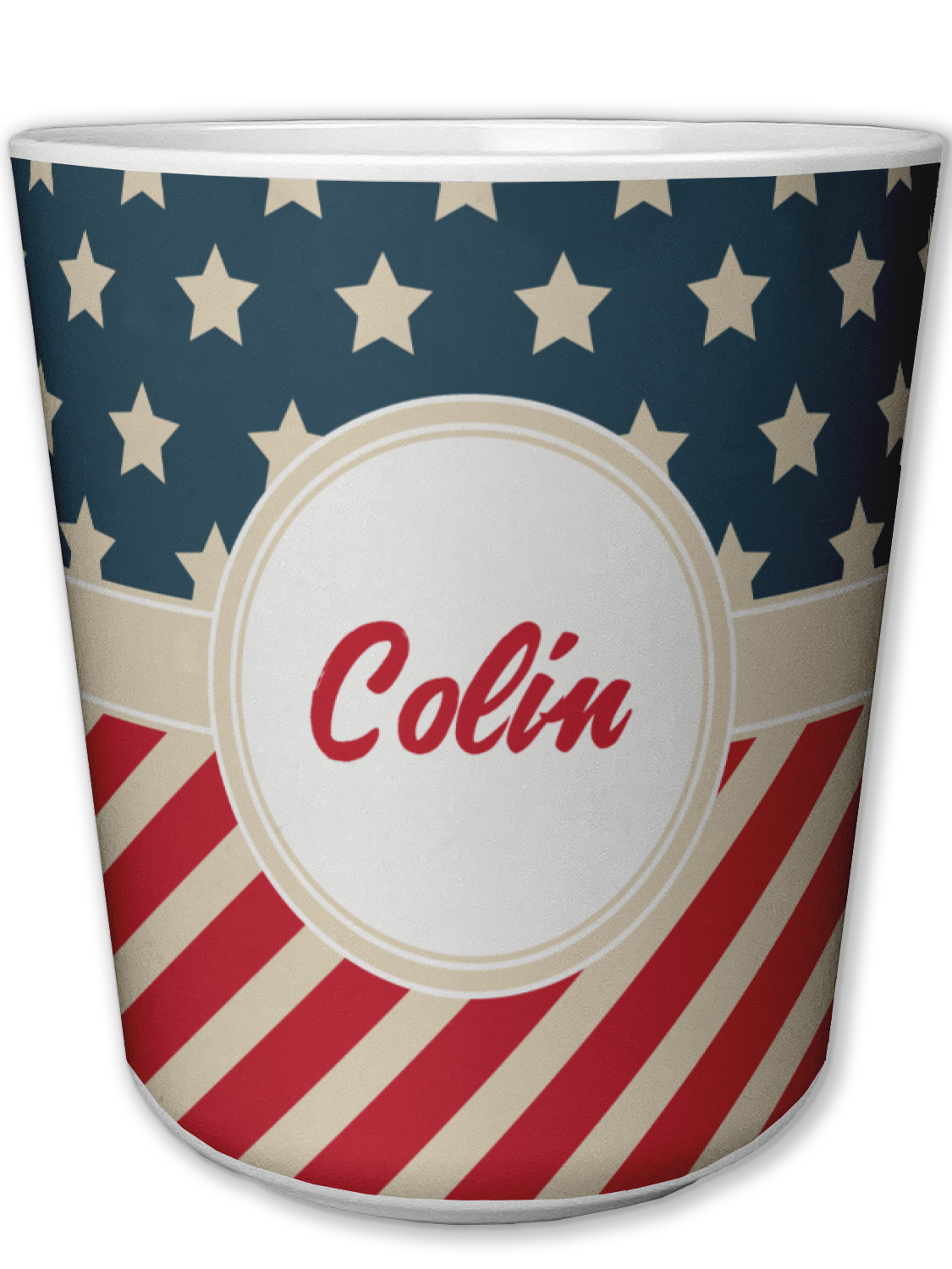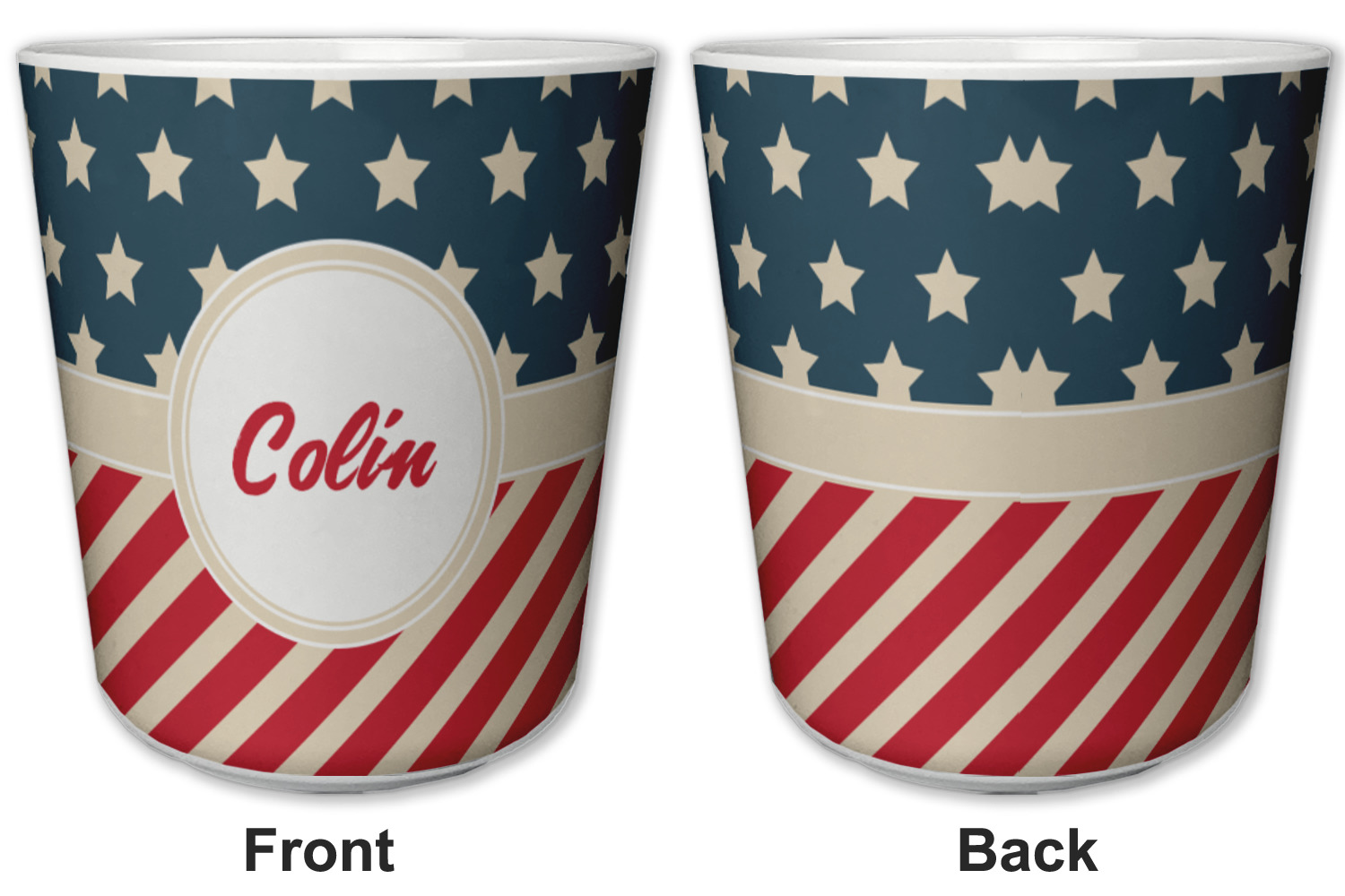 This design is a dark blue, bright red, and cream. The top half is white stars and a dark blue background, while the bottom half is a red and cream diagonal striped background. The backgrounds are divided by a cream ribbon and frame with your personalization in the middle. Have fun decorating with this classic patriotic design.