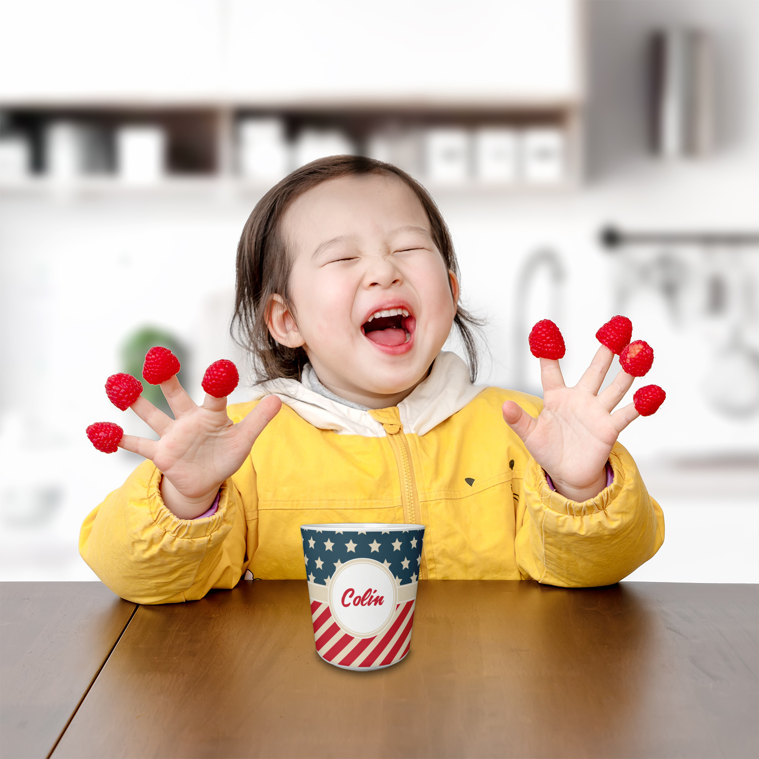 Made from a durable plastic, these tumbler cups are strong enough to withstand daily use and are perfect for young children. Each of these personalized plastic cups holds 6 ounces and measure at approximately 3" x 3" x 3.25". Place them in the bathroom as a rinsing cup, or give them to your kids during mealtimes. These 6 oz. plastic cups are BPA free, microwave and dishwasher safe, for your convenience. Your personalized design is displayed across the entire outside of this cup, while the inside is white in color to make your customization really stand out.