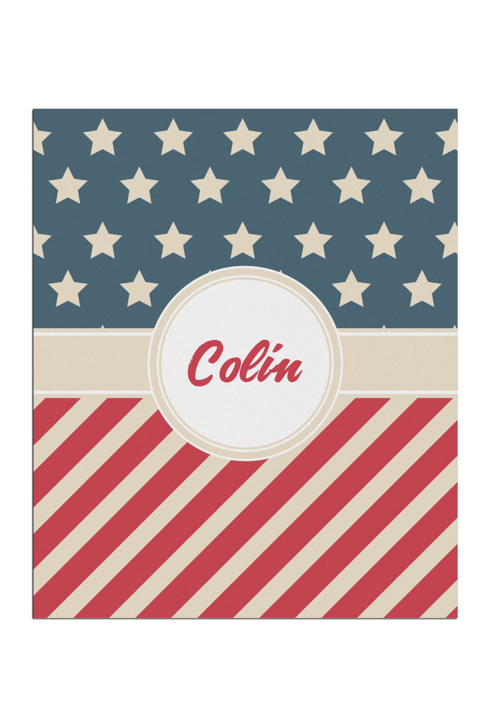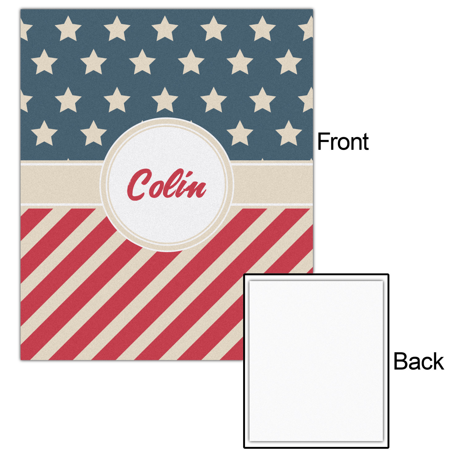 This design is a dark blue, bright red, and cream. The top half is white stars and a dark blue background, while the bottom half is a red and cream diagonal striped background. The backgrounds are divided by a cream ribbon and frame with your personalization in the middle. Have fun decorating with this classic patriotic design.