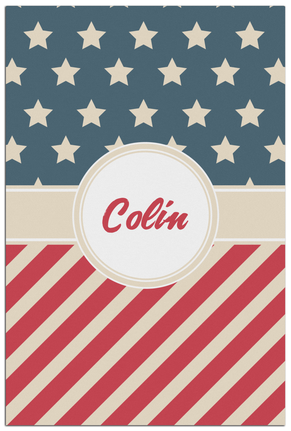 This design is a dark blue, bright red, and cream. The top half is white stars and a dark blue background, while the bottom half is a red and cream diagonal striped background. The backgrounds are divided by a cream ribbon and frame with your personalization in the middle. Have fun decorating with this classic patriotic design.