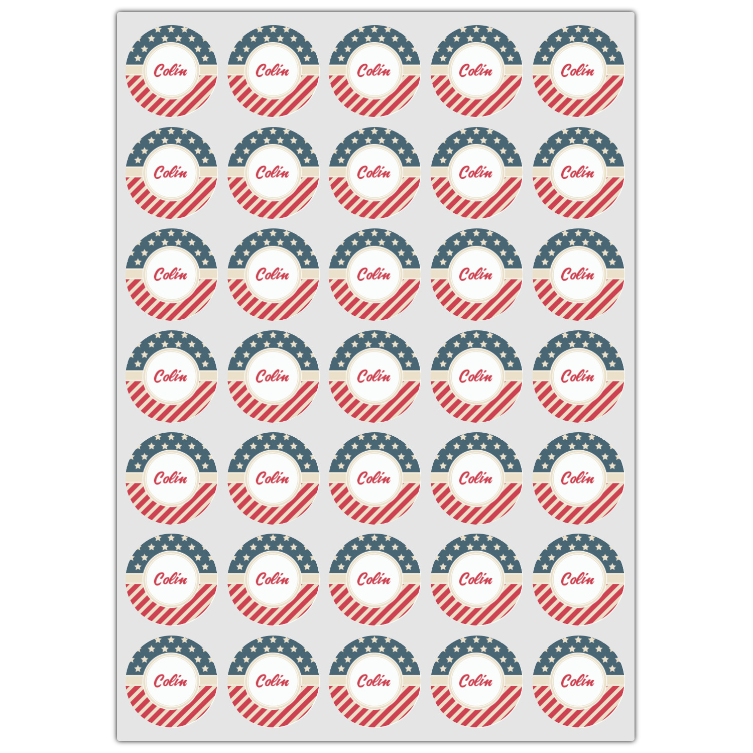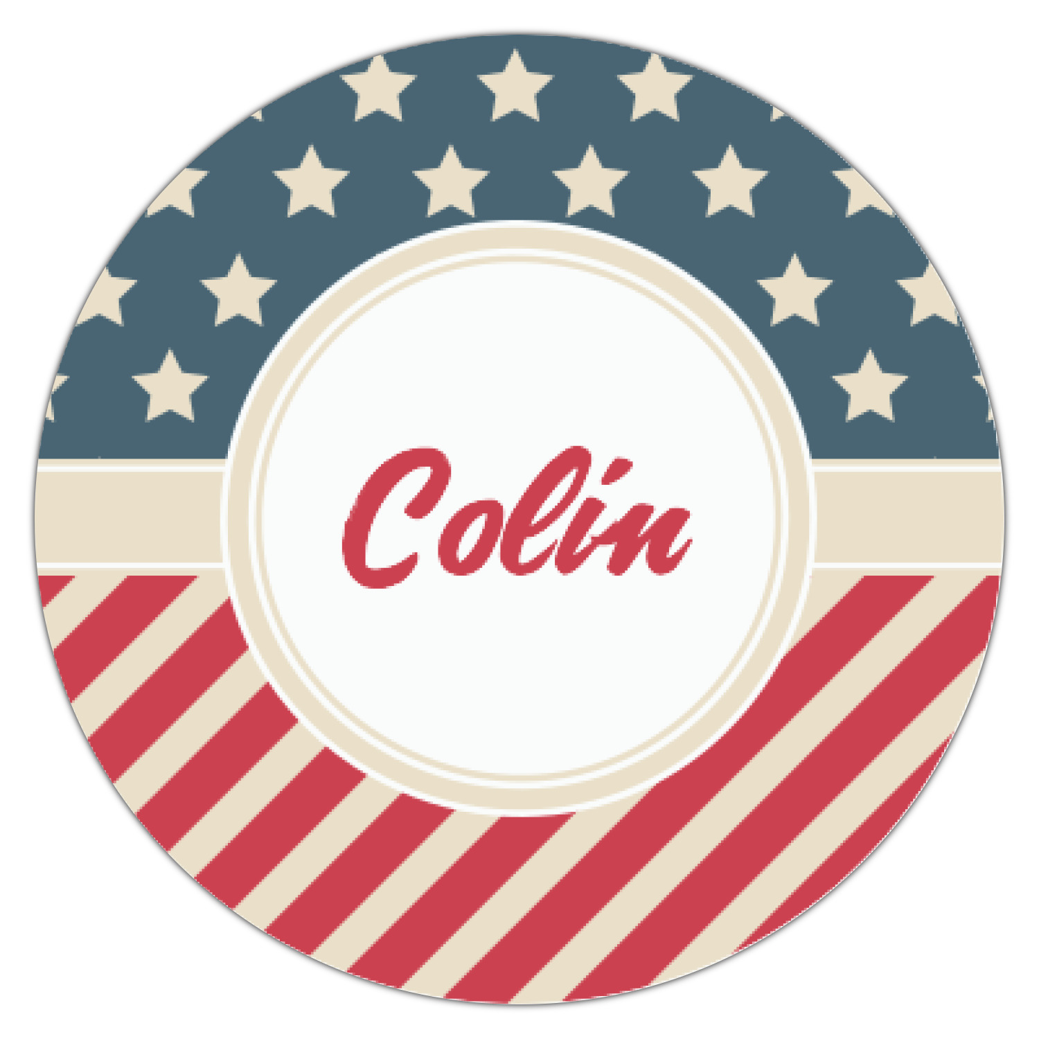 This design is a dark blue, bright red, and cream. The top half is white stars and a dark blue background, while the bottom half is a red and cream diagonal striped background. The backgrounds are divided by a cream ribbon and frame with your personalization in the middle. Have fun decorating with this classic patriotic design.