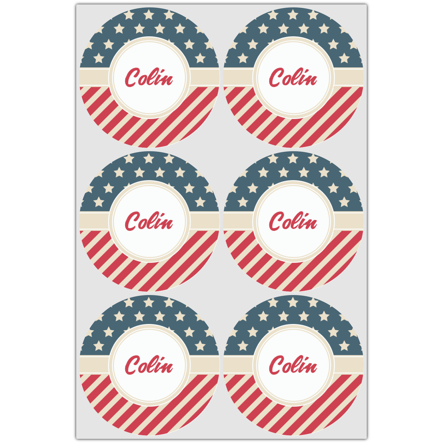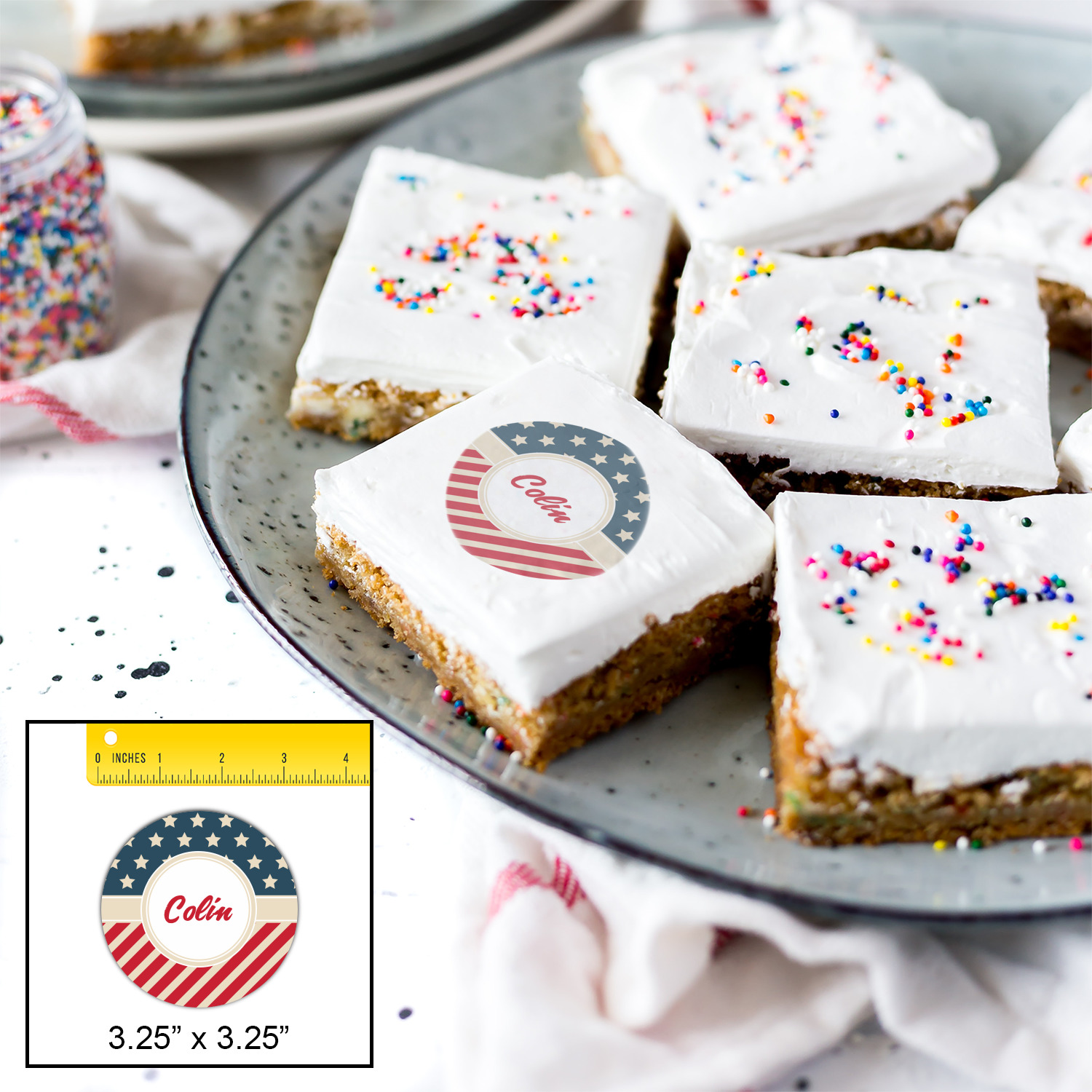 This design is a dark blue, bright red, and cream. The top half is white stars and a dark blue background, while the bottom half is a red and cream diagonal striped background. The backgrounds are divided by a cream ribbon and frame with your personalization in the middle. Have fun decorating with this classic patriotic design.