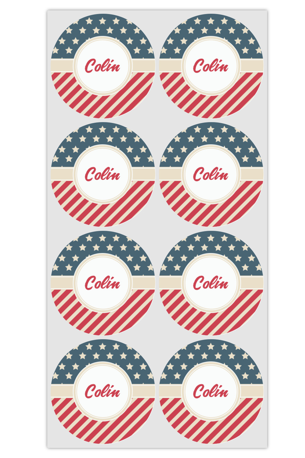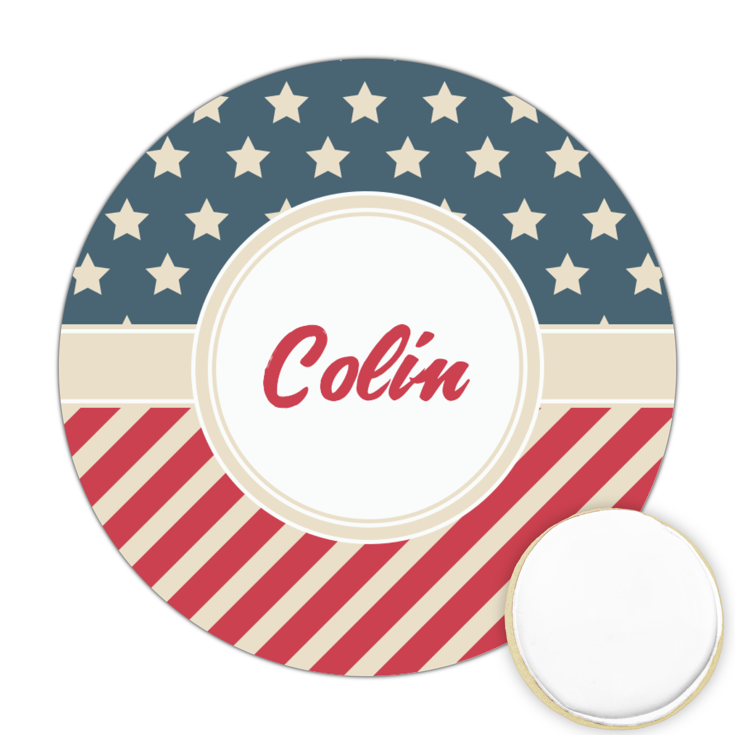 This design is a dark blue, bright red, and cream. The top half is white stars and a dark blue background, while the bottom half is a red and cream diagonal striped background. The backgrounds are divided by a cream ribbon and frame with your personalization in the middle. Have fun decorating with this classic patriotic design.