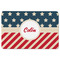 This design is a dark blue, bright red, and cream. The top half is white stars and a dark blue background, while the bottom half is a red and cream diagonal striped background. The backgrounds are divided by a cream ribbon and frame with your personalization in the middle. Have fun decorating with this classic patriotic design.
