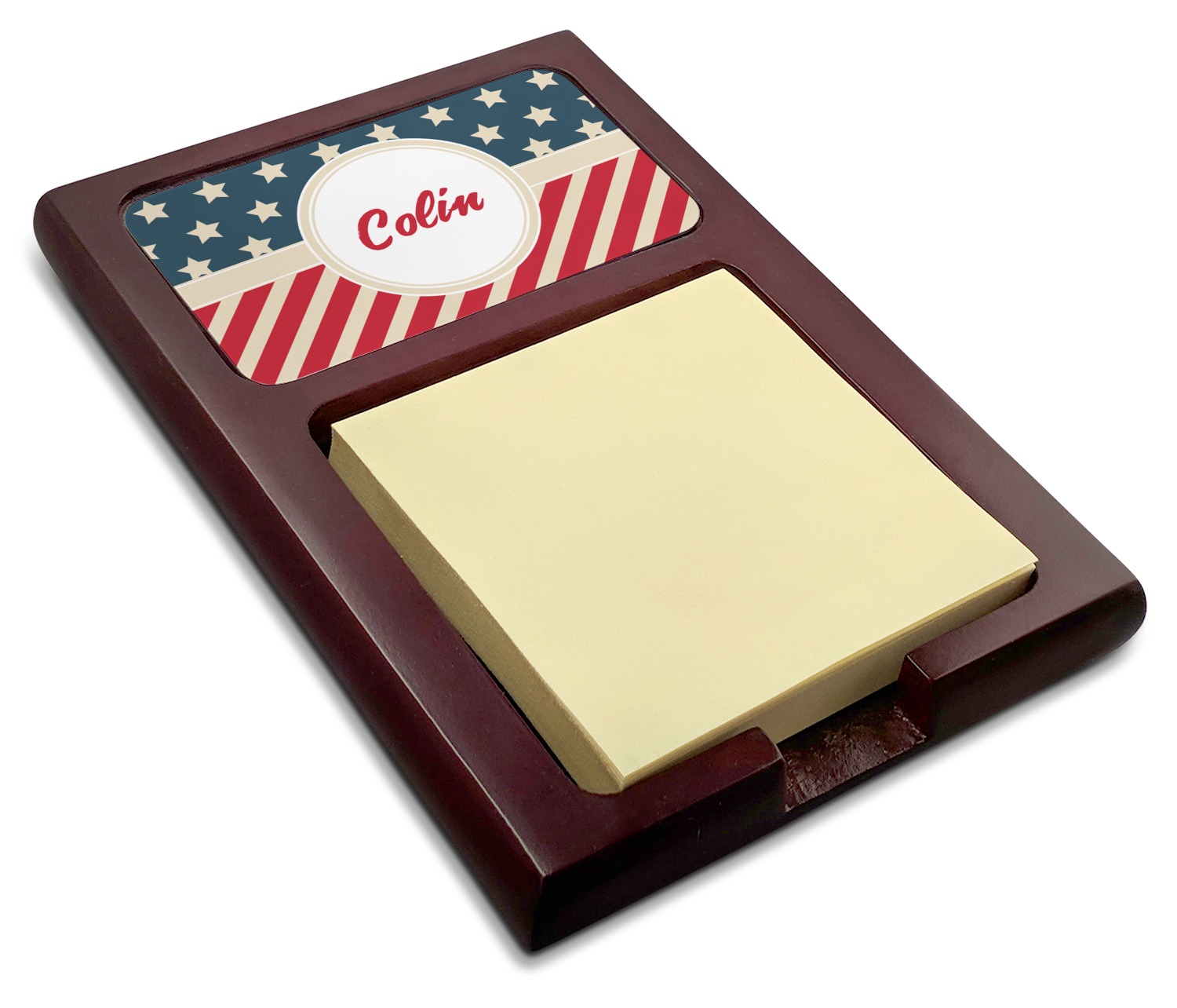 Crafted from a fine mahogany, this post it note holder is in the shade of a dark, cherry color. The dispenser itself is about 4.25 by 6.25 by 0.75 inches. You can place your 3 by 3 inch sticky notes in the indentation below the nameplate. We print your customization onto the nameplate that rests above the velvety indentation.