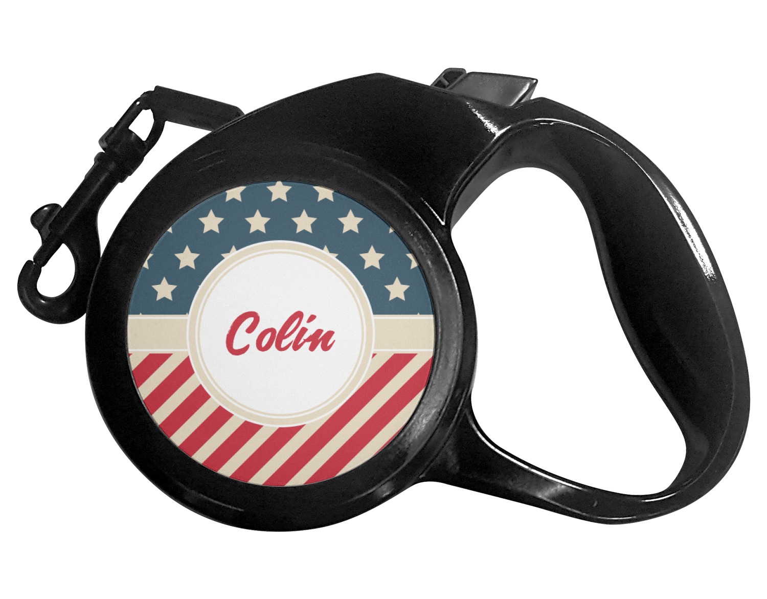 The leash's plastic handle is accommodating of your grip and displays your customization on both sides. The dog leash also features the traditional bolt snap clip, for easy fastening to your dog's collar. The leash and leash handle themselves are both black in color.
