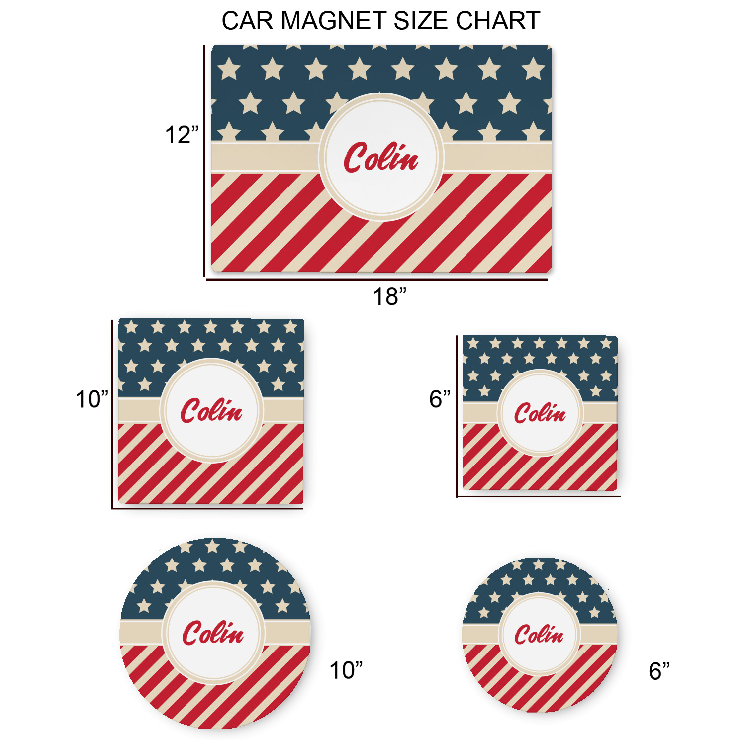 Your personalized car magnets are available for purchase in two shapes and two sizes. We carry round and square editions; each shape can either be 6 by 6 inches, or 10 by 10 inches, depending on your needs. Both versions are 1 millimeter thick, which is considered, within the industry, as the ideal thickness for automobile magnets. The magnetic car decals will adhere to any smooth, metal surface of your cars body, such as the trunk door or a side panel. However, please note that some vehicles are constructed from fiberglass bodies, which prevents the adhesion of anything magnetic. We advise that you test your vehicle before purchasing these magnets.