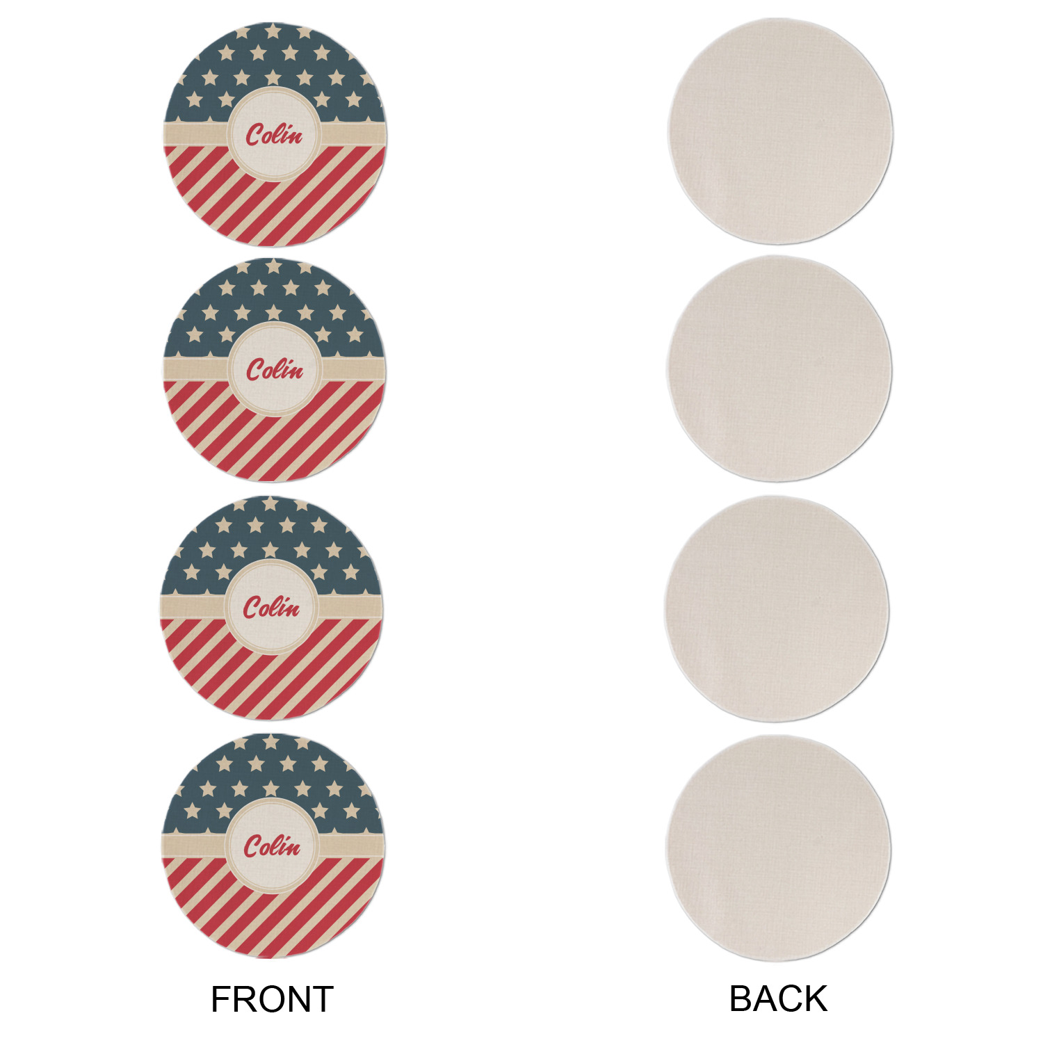 This design is a dark blue, bright red, and cream. The top half is white stars and a dark blue background, while the bottom half is a red and cream diagonal striped background. The backgrounds are divided by a cream ribbon and frame with your personalization in the middle. Have fun decorating with this classic patriotic design.
