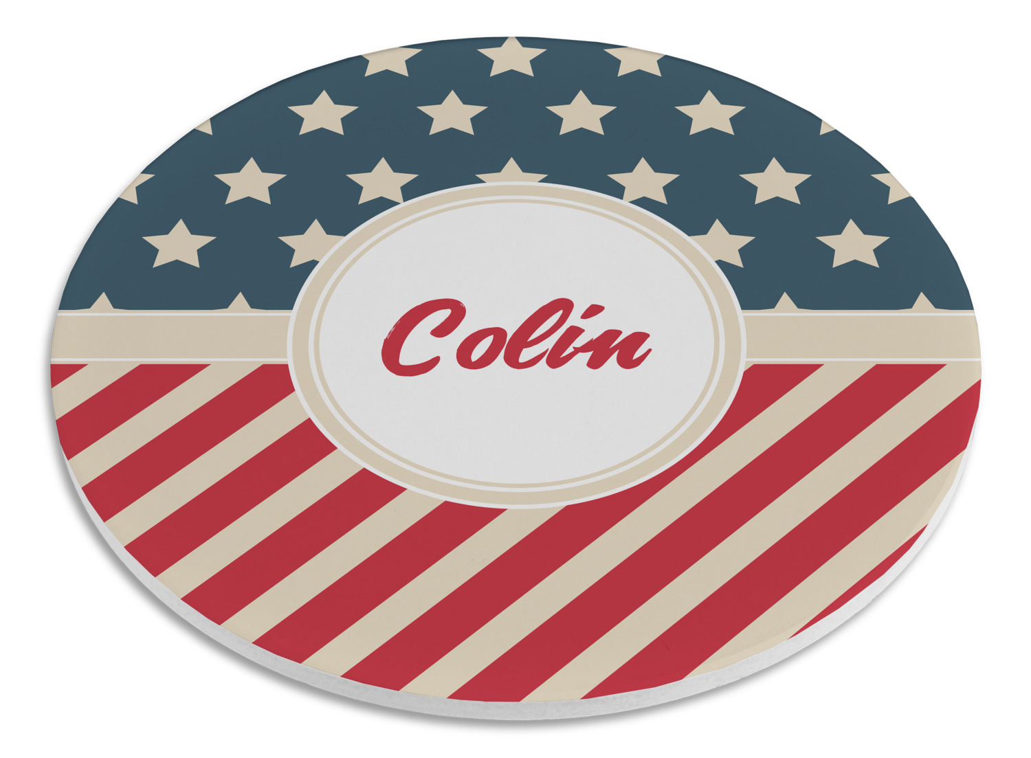 This design is a dark blue, bright red, and cream. The top half is white stars and a dark blue background, while the bottom half is a red and cream diagonal striped background. The backgrounds are divided by a cream ribbon and frame with your personalization in the middle. Have fun decorating with this classic patriotic design.