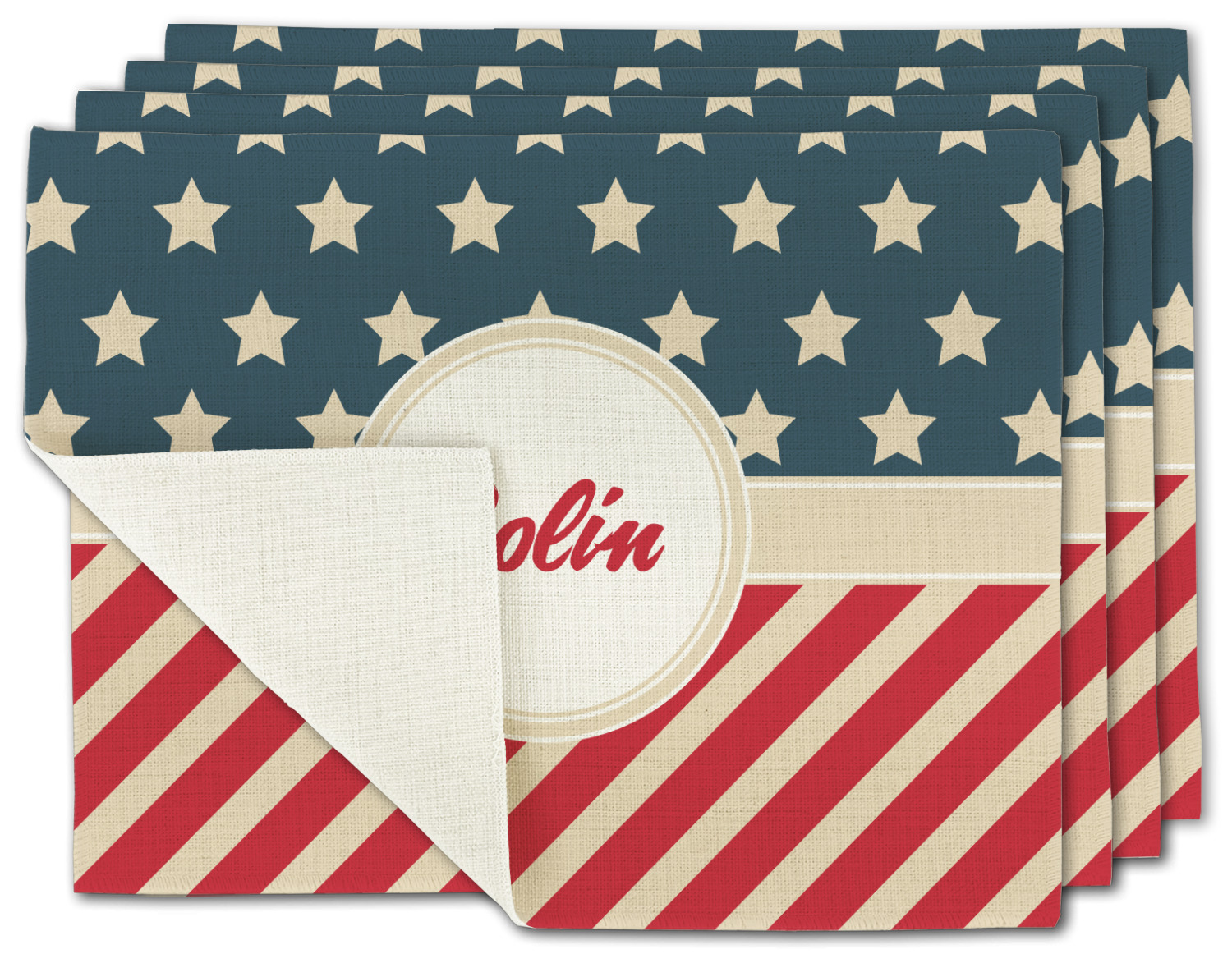 This design is a dark blue, bright red, and cream. The top half is white stars and a dark blue background, while the bottom half is a red and cream diagonal striped background. The backgrounds are divided by a cream ribbon and frame with your personalization in the middle. Have fun decorating with this classic patriotic design.